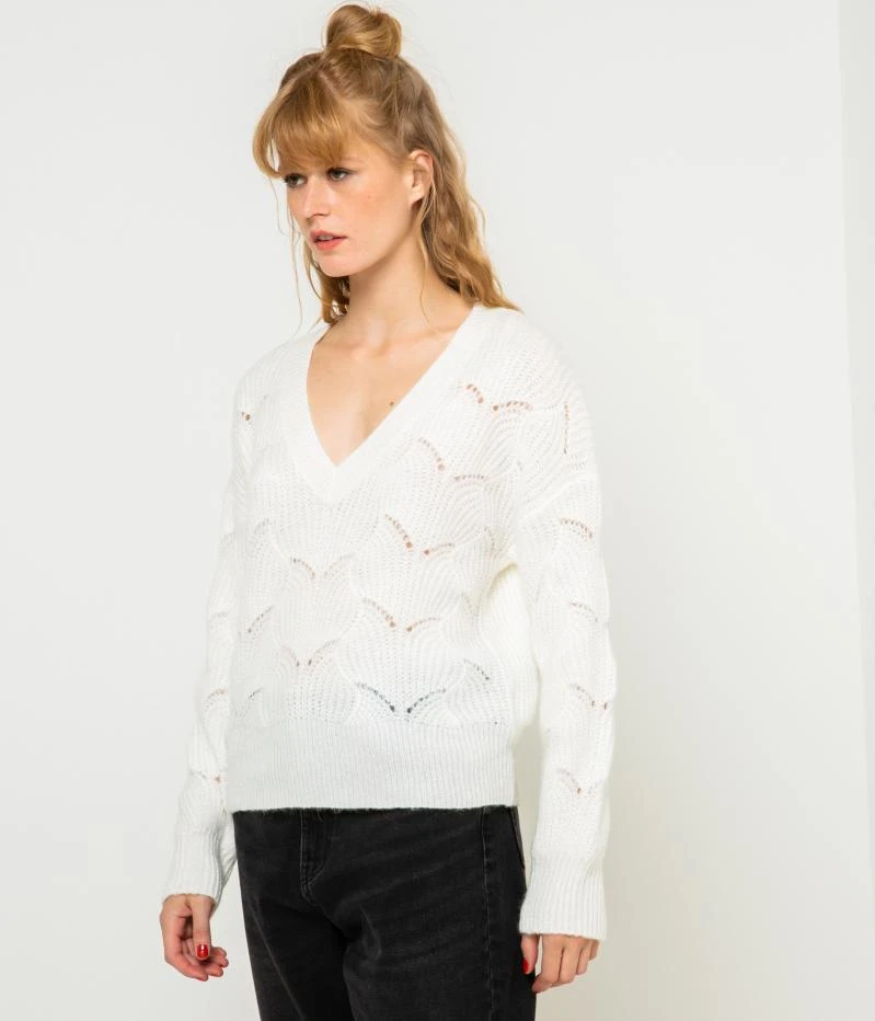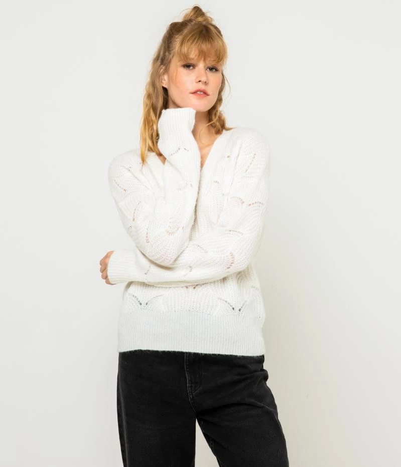 Vente Pull laineux femme maille ajourée Camaieu – Un pull femme confectionné en poly-acrylique, laine et alpaga. Coupe droite finement ajustée, maille fantaisie ajourée, jeu de torsades, grande encolure V, emmanchures descendues, manches longues, bord-côtes. Le mannequin mesure 1.76M et porte une taille M.