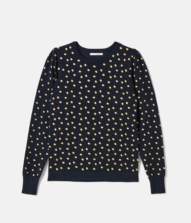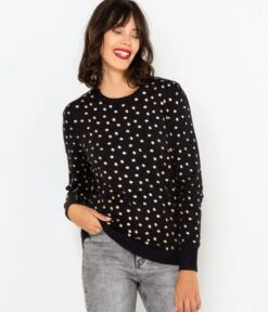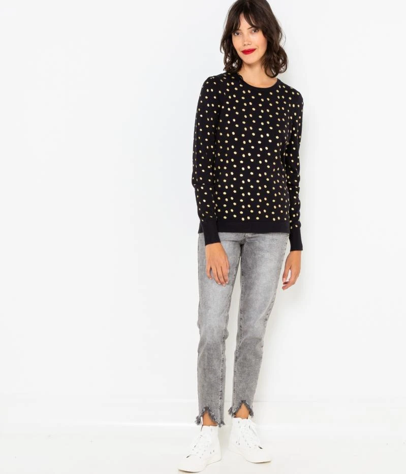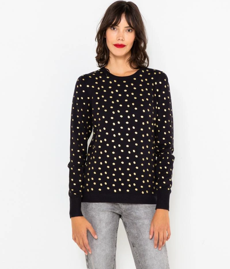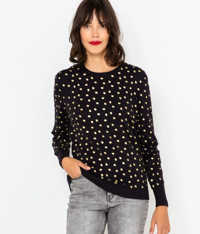 Vente Pull manches ballons femme à pois dorés viscose responsable Camaieu – Un pull femme confectionné en maille fine de viscose responsable et nylon. Coupe droite finement ajustée, encolure ronde, fronces aux emmanchures, bord-côte aux bas des manches et à la taille, print pois dorés en all over. Le mannequin mesure 1.68M et porte une taille M. Ce produit a été fabriqué à partir de matière cellulosique issue de bois provenant de forêt éco-gérée et transformée grâce à un procédé réduisant la consommation d’eau.