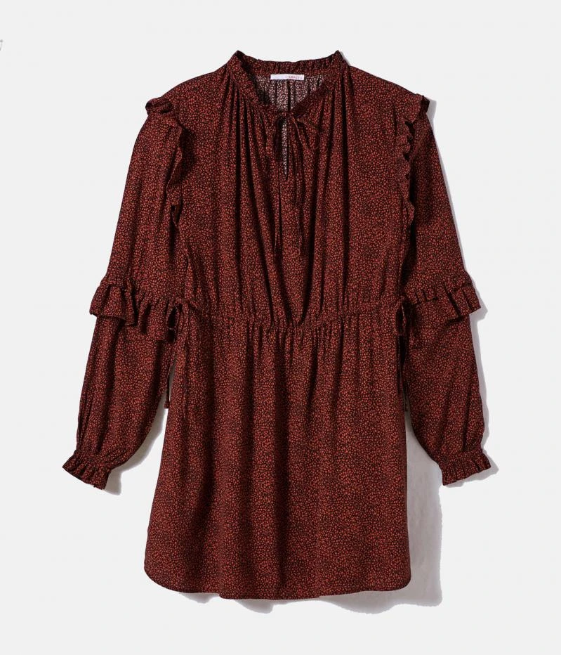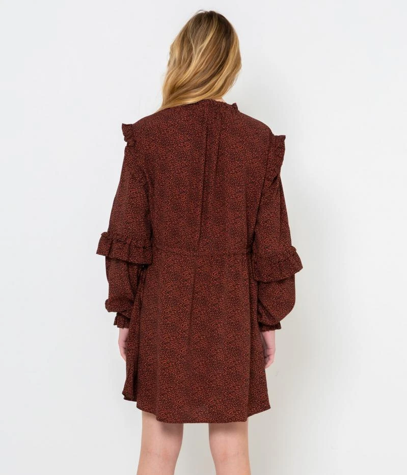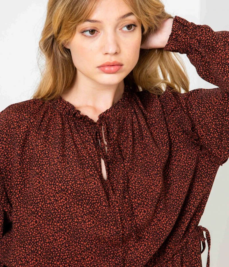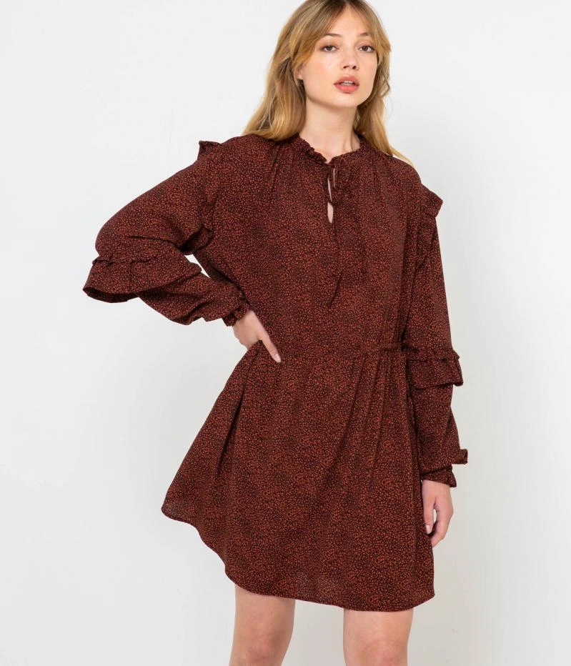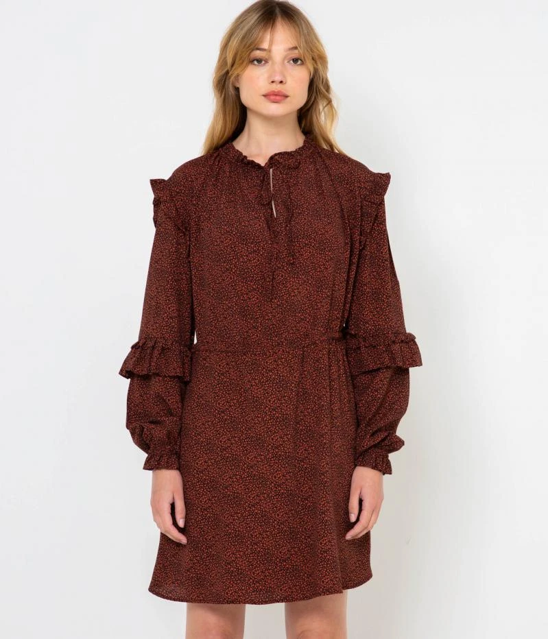 Vente Robe ample imprimée Camaieu – Une robe femme confectionnée en viscose fluide. Coupe droite finement élargie, jeu de volants placés au col montant froncé, aux emmanchures, le long des manches longues et aux poignets, encolure ouverte ornée de liens à nouer laissant apparaitre une ouverture, découpe sous poitrine, imprimé en all over. Le mannequin mesure 1.75M et porte une taille M.