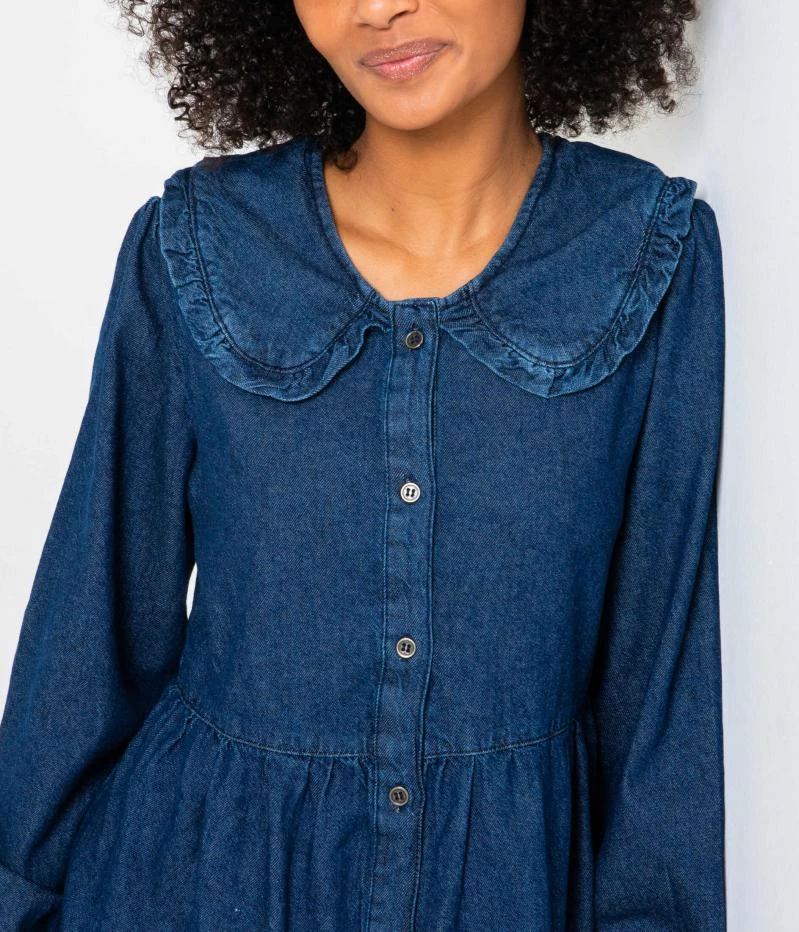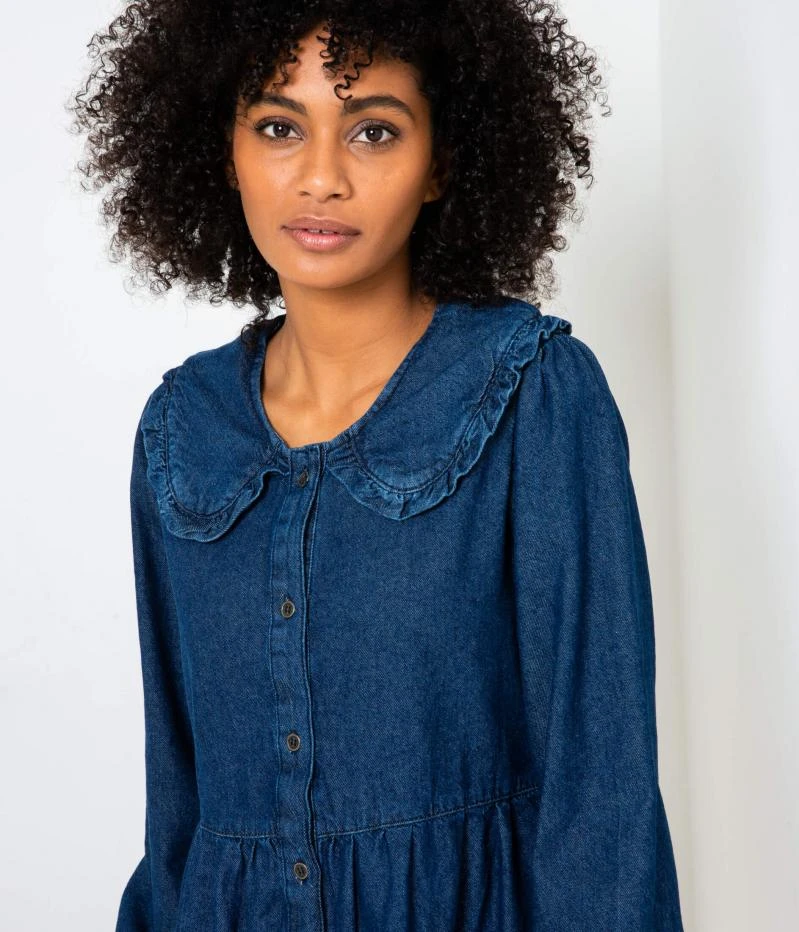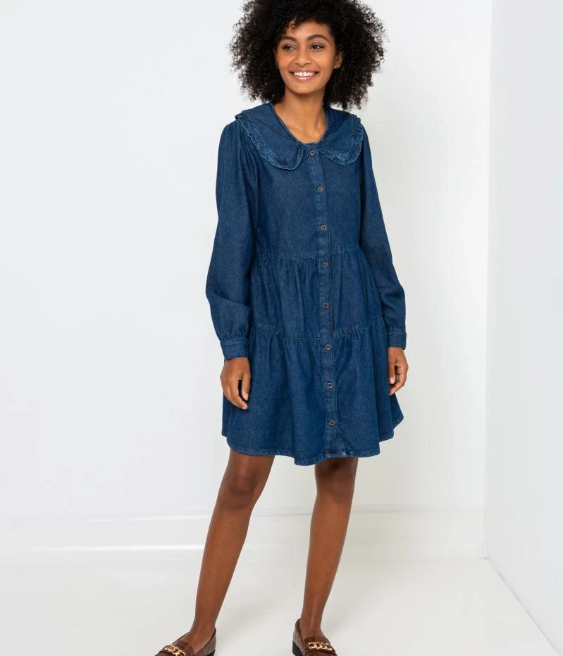 Vente Robe boutonnée en denim Camaieu – Une robe femme confectionnée en denim de coton. Coupe droite qui s’évase délicatement par un jeu de volants, boutonnée devant, encolure ronde orné d’un col claudine, bouton aux bas des manches longues. Le mannequin mesure 1.75M et porte une taille 38.
