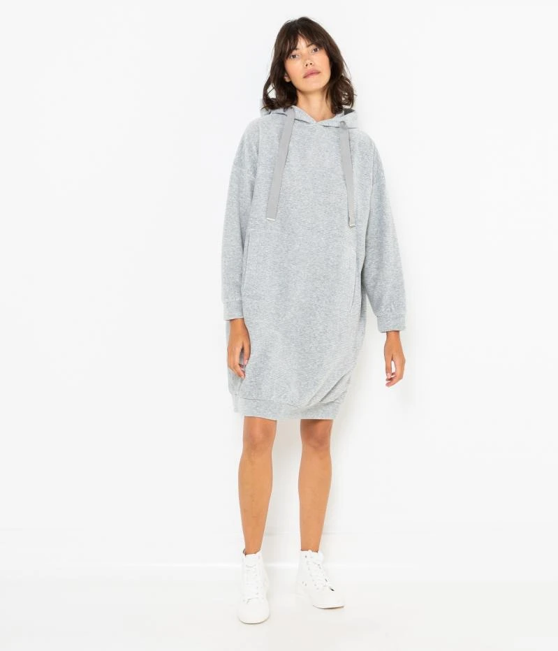 Vente Robe capuche velours côtelé Camaieu – Un robe femme confectionnée en maille de poly-coton et élasthanne pour plus de confort. Coupe droite, capuche avec cordons gros grains, poche kangourou devant, manches longues, bord-côte. Le mannequin mesure 1.75M et porte une taille M.