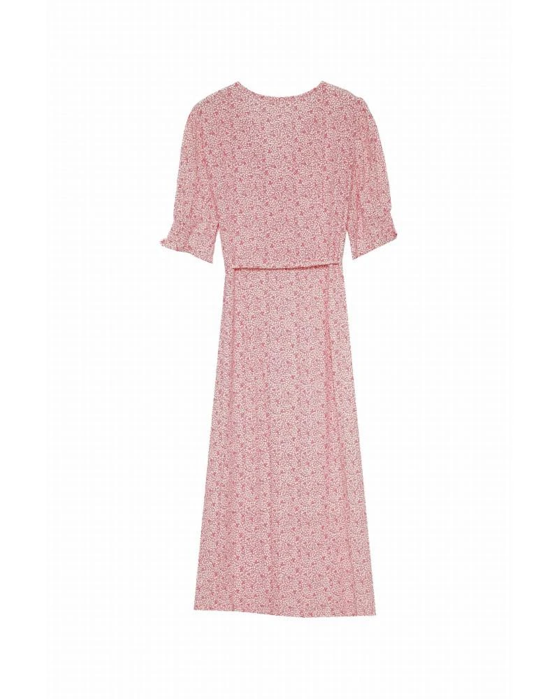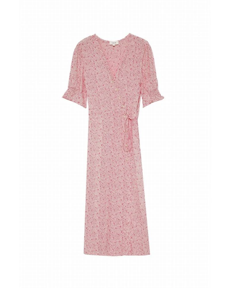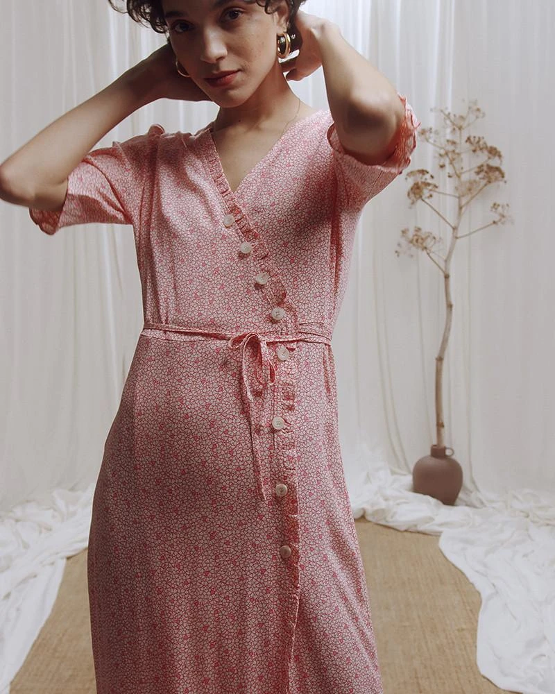 La coupe : CARMEN est une robe portefeuille à manches courtes légèrement bouffantes avec des bordures froncées et un décolleté en V.