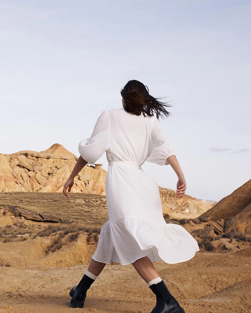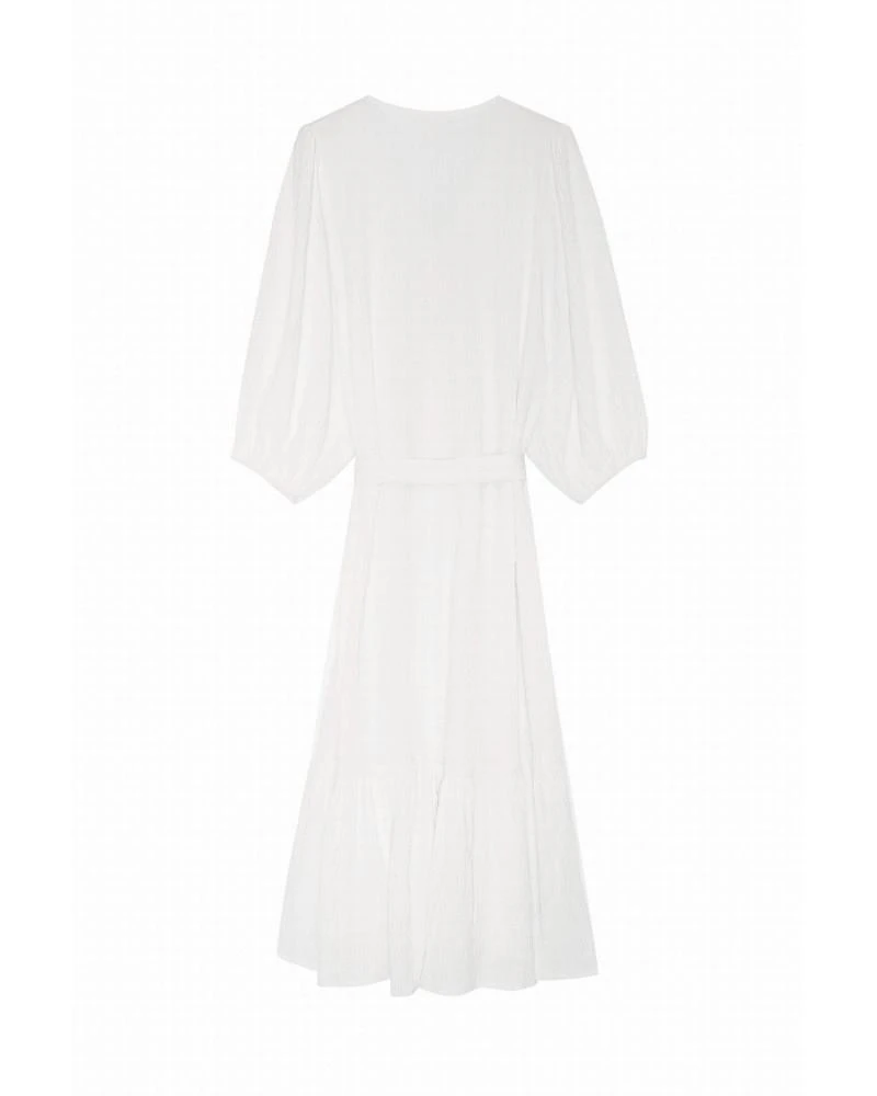 La coupe : CARSTEN est une robe midi en seersucker (tissu gaufré), manches 3/4 avec un décolleté en V. Elle possède une patte de boutonnage sur le devant et des découpes de volants sur la partie jupe, avec une ceinture de tissu à nouer.