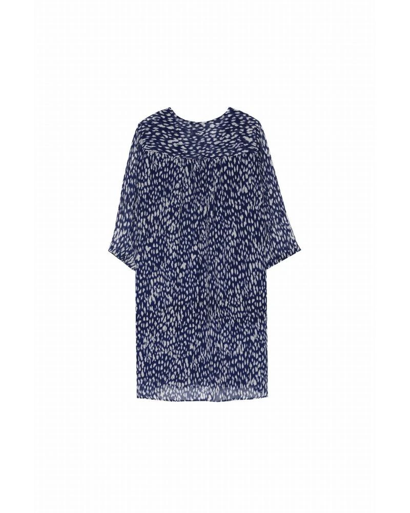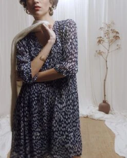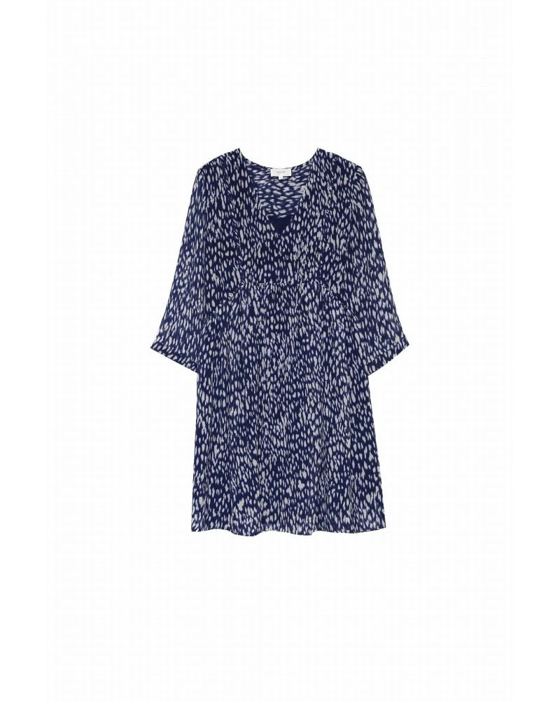 La coupe : CELIA est une robe babydoll manches 3/4 en mousseline imprimée avec un décolleté en V.