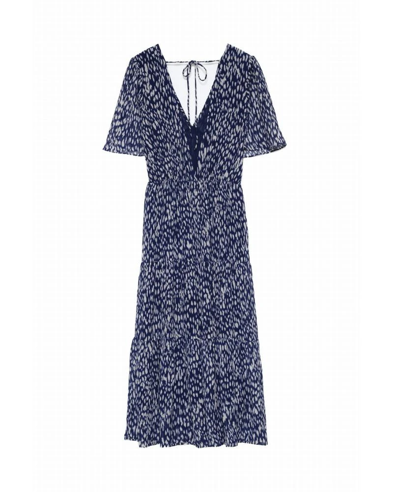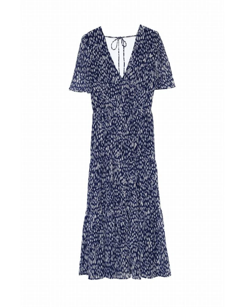 La coupe : CERENA est une robe midi en mousseline imprimée à manches courtes évasées, avec un décolleté en V sur le devant et une encolure plongeante dans le dos avec un lien à nouer à la taille.