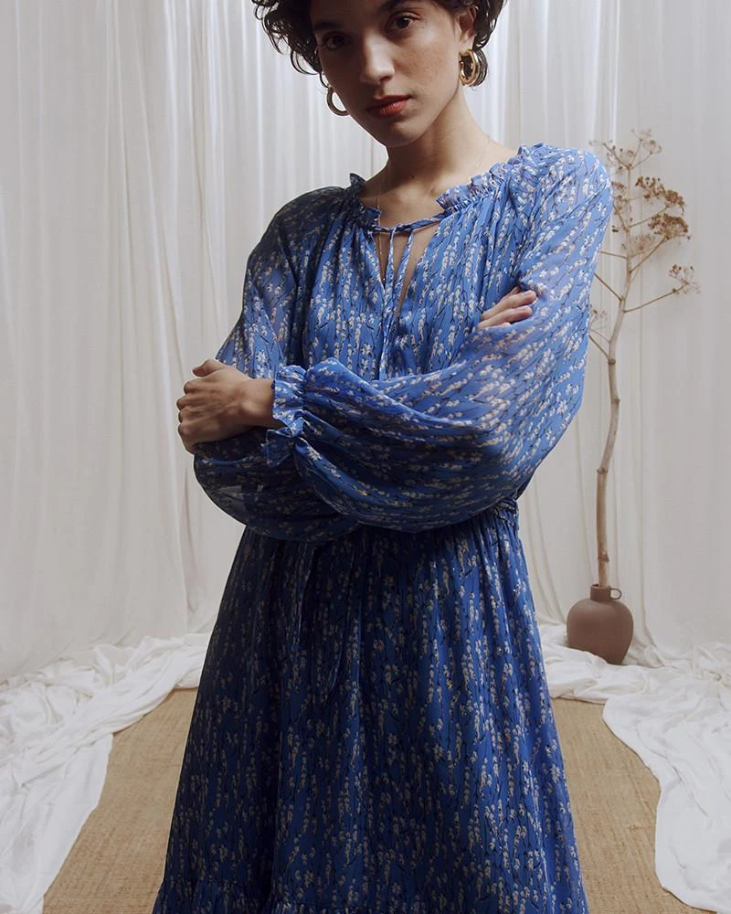 « La coupe : CHARLINE est une robe longue en mousseline imprimée de délicates fleurs japonaises.
