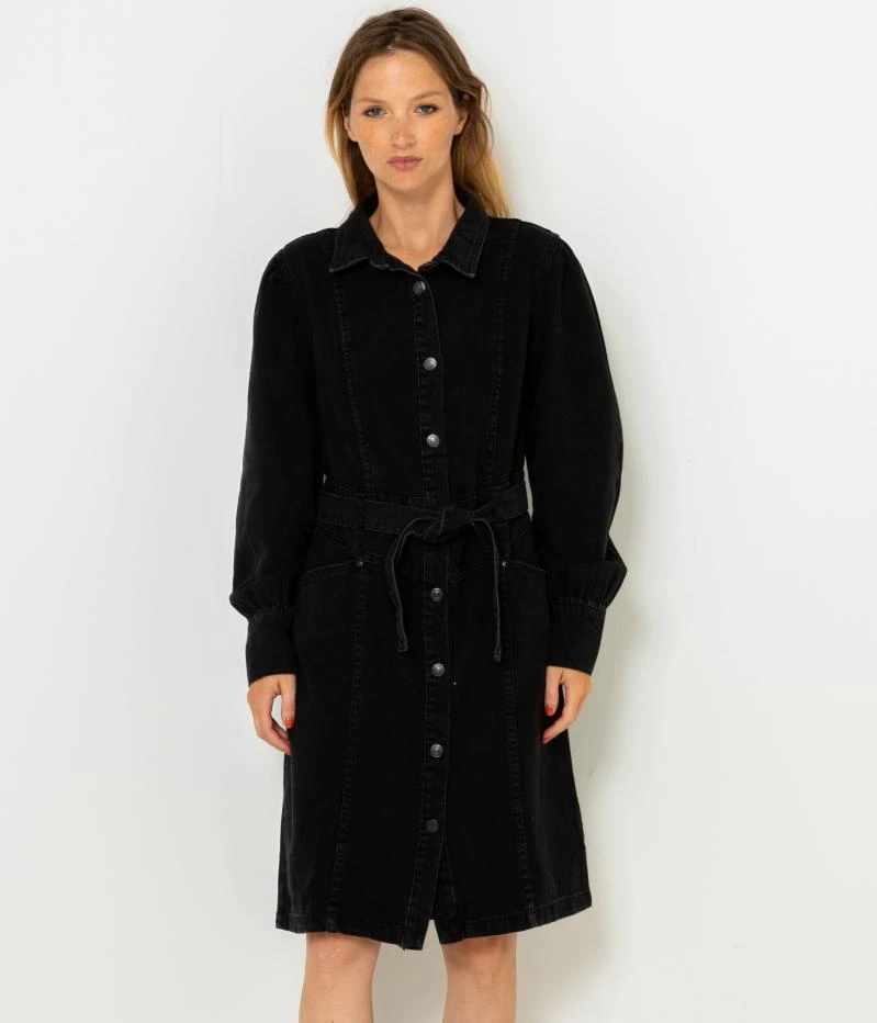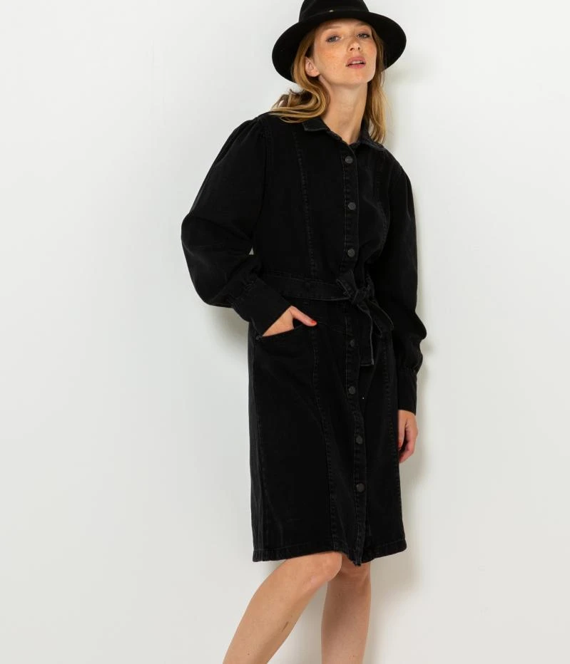 Vente Robe chemise en jean waterless process Camaieu – Une robe chemise femme confectionnée en denim de coton. Coupe droite finement ajustée par un lien ceinture sous passants à nouer, longueur genoux, col chemise, entièrement boutonnée devant par boutons métal, manches longues, jeu de découpes, poches devant. Ce produit a été fabriqué à partir d’un procédé de délavage réduisant la consommation d’eau. Le mannequin mesure 1.70M et porte une taille 38.