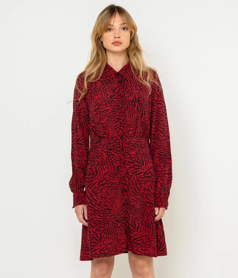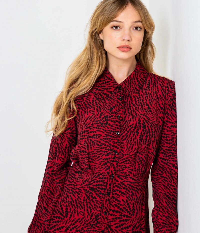 Vente Robe chemise imprimé coeurs Camaieu – Une robe femme confectionnée en viscose fluide à l’imprimé coeurs en all over. Col chemise, patte boutonnée devant, longueur genoux, manches longues resserrées. Le mannequin mesure 1.75M et porte une taille 38.