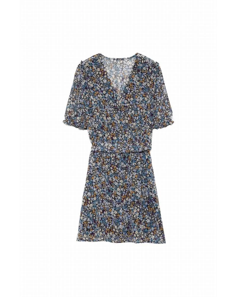 La coupe : CHRISTELLE est une robe fluide avec une encolure V, des manches courtes ballons et une ceinture tissu à nouer à la taille.