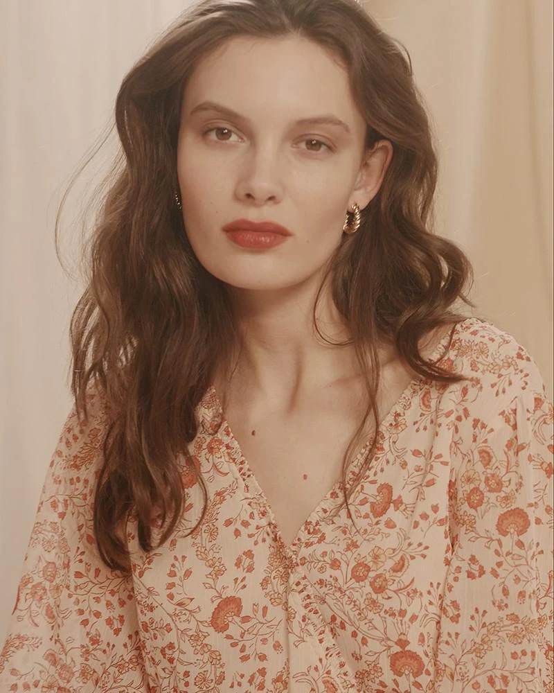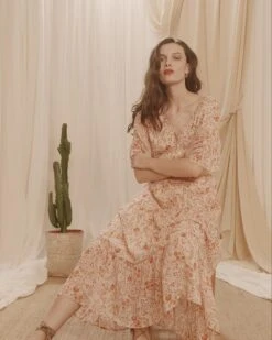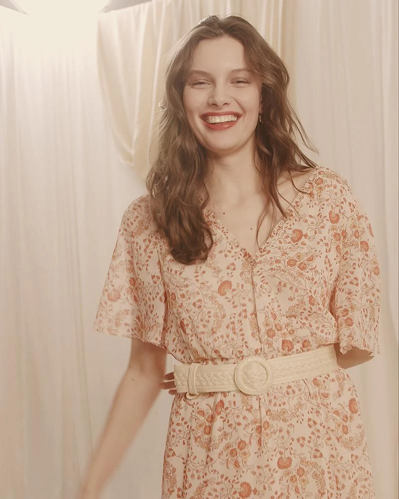 La coupe : CLEMENCE est une robe longue en mousseline de soie imprimée avec un décolleté effet cache-coeur, une ouverture en V et une taille élastiquée avec une ceinture de tissu à nouer.