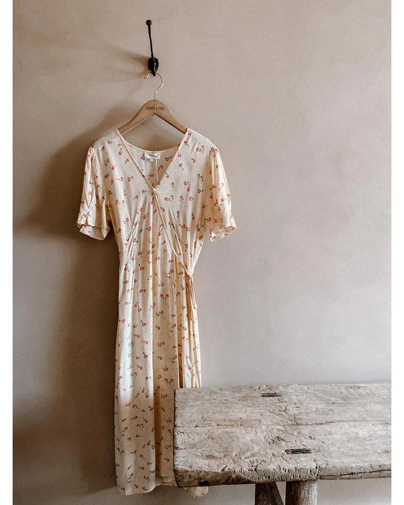 La coupe : CLEMENTINE est une robe portefeuille à imprimé exclusif Grace & Mila avec un décolleté en V, des manches courtes bouffantes et une ceinture de tissu à nouer à la taille.