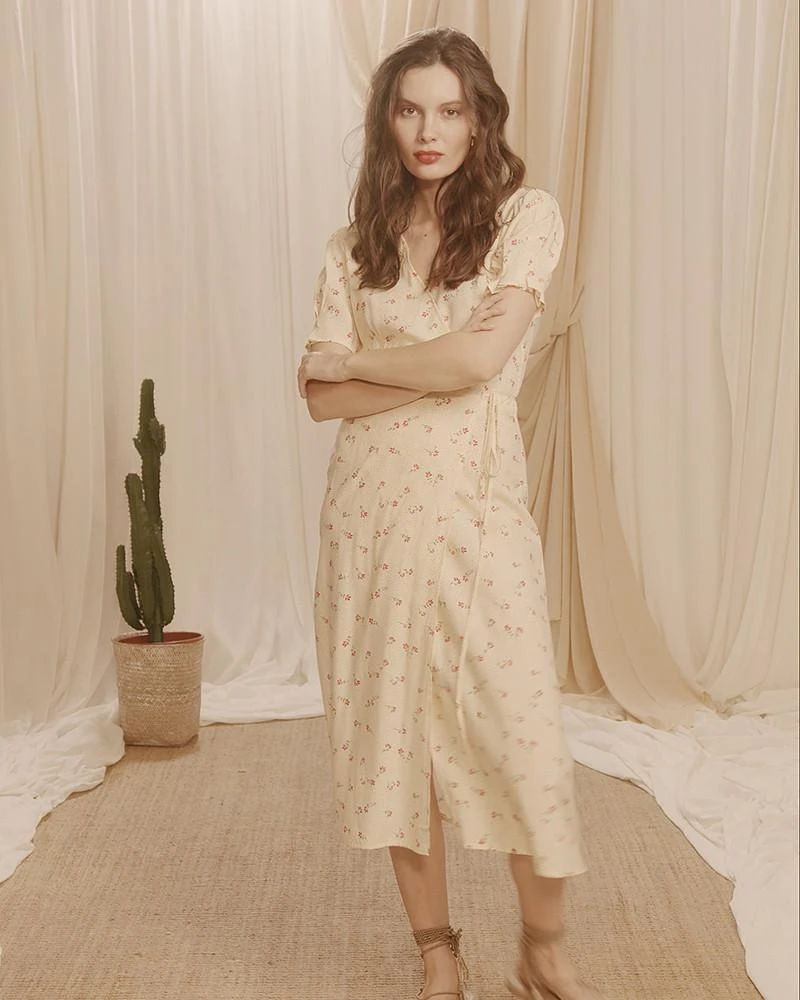 La silhouette : Vous l’aviez adoré la saison dernière, notre robe cache-cœur fleurie est de retour avec un style rétro-chic assumé ! Plus pointue, avec un tissu viscose-rayonne et des coloris doux, crémeux et pastels, la jolie CLEMENTINE est à tomber. On adore le détail des manches bouffantes légèrement volantées et son imprimé Grace & Mila frais comme la rosée.