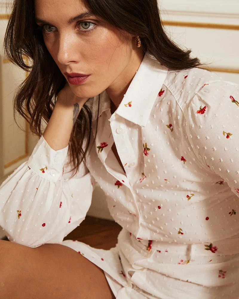 La coupe : CONCORDE est une robe chemise midi ( doublée ) en popeline jacquard plumetis, avec un col italien et des manches longues boutonnées aux poignets.