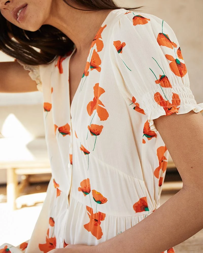 La coupe : COTILLARD est une robe courte imprimée à manches courtes tulipes, avec un décolletée en V et un détail de boutons sur le devant.
