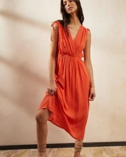 La coupe : CRILLON est une robe midi décolletée en V sans manches avec cordon de serrage, un bouton-pression caché sur le devant et une taille élastiquée.