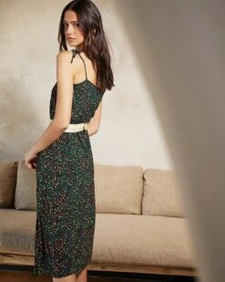 La coupe : CURIEUSE est une robe midi imprimée avec des bretelles à nouer, un décolleté en V, une patte de boutonnage sur le devant, une fente latérale sur le bas de robe, une ceinture de tissu à nouer à la taille et des poches latérales.