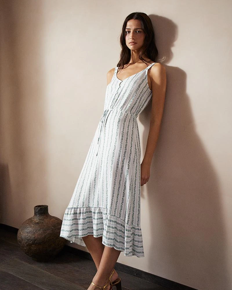 La coupe : CYBILLE est une robe midi imprimée avec un décolleté en V sur le devant et dans le dos, de larges bretelles, une patte de boutonnage sur le devant et une ceinture de tissu à nouer à la taille.