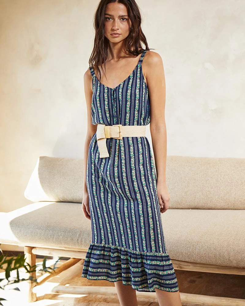 La coupe : CYBILLE est une robe midi imprimée avec un décolleté en V sur le devant et dans le dos, de larges bretelles, une patte de boutonnage sur le devant et une ceinture de tissu à nouer à la taille.