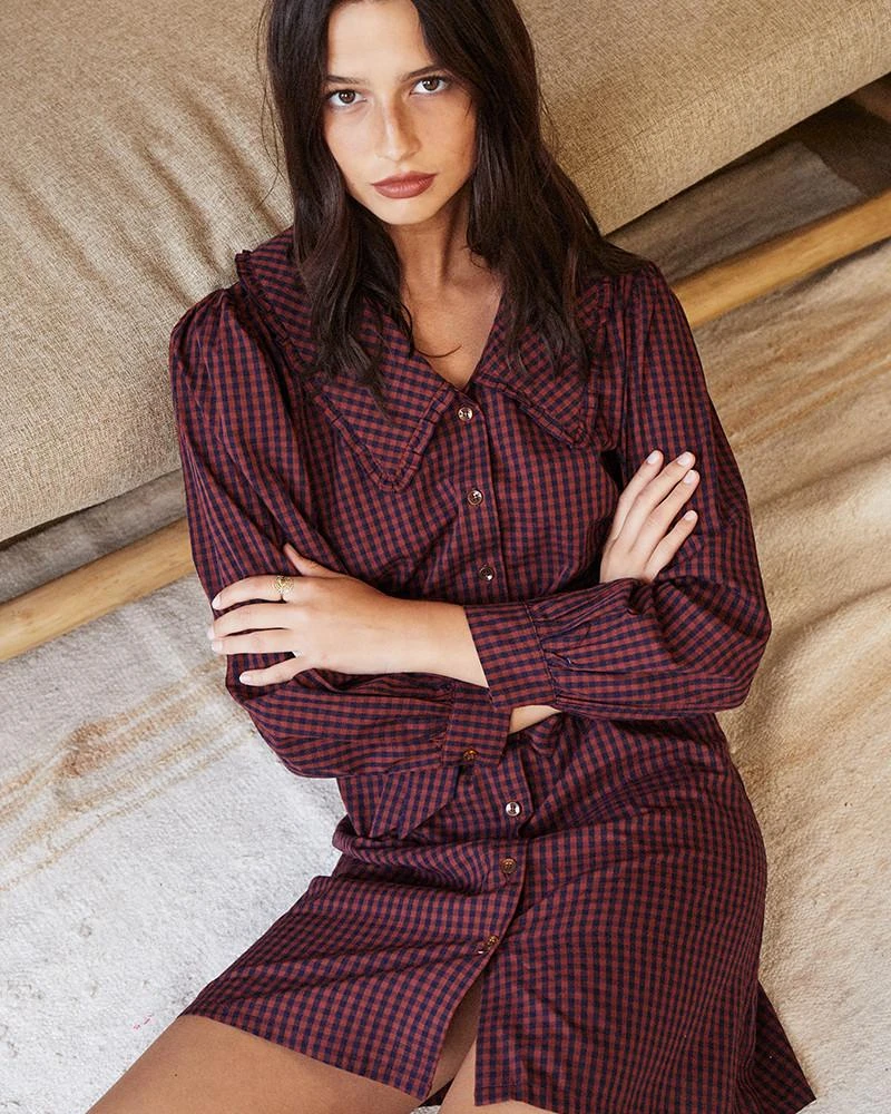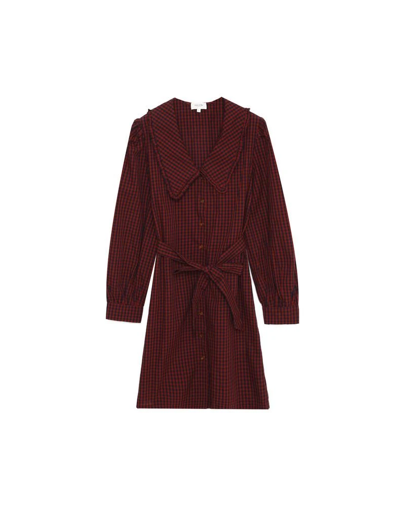 La coupe : DANETTE est une robe courte à carreaux, à manches longues bouffantes avec un col Claudine oversize et une encolure en V, des poignets boutonnés et une ceinture à nouer à la taille.
