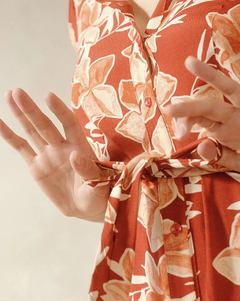 La coupe : DANITA est une robe chemise midi à manches 3/4 avec un col chemise classique, une ceinture à nouer à la taille, une patte de boutonnage sur le devant et une fente latérale à l’ourlet.