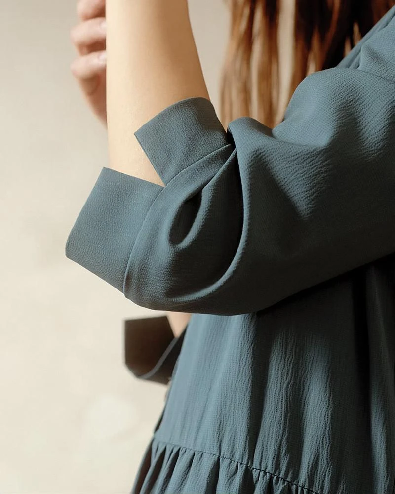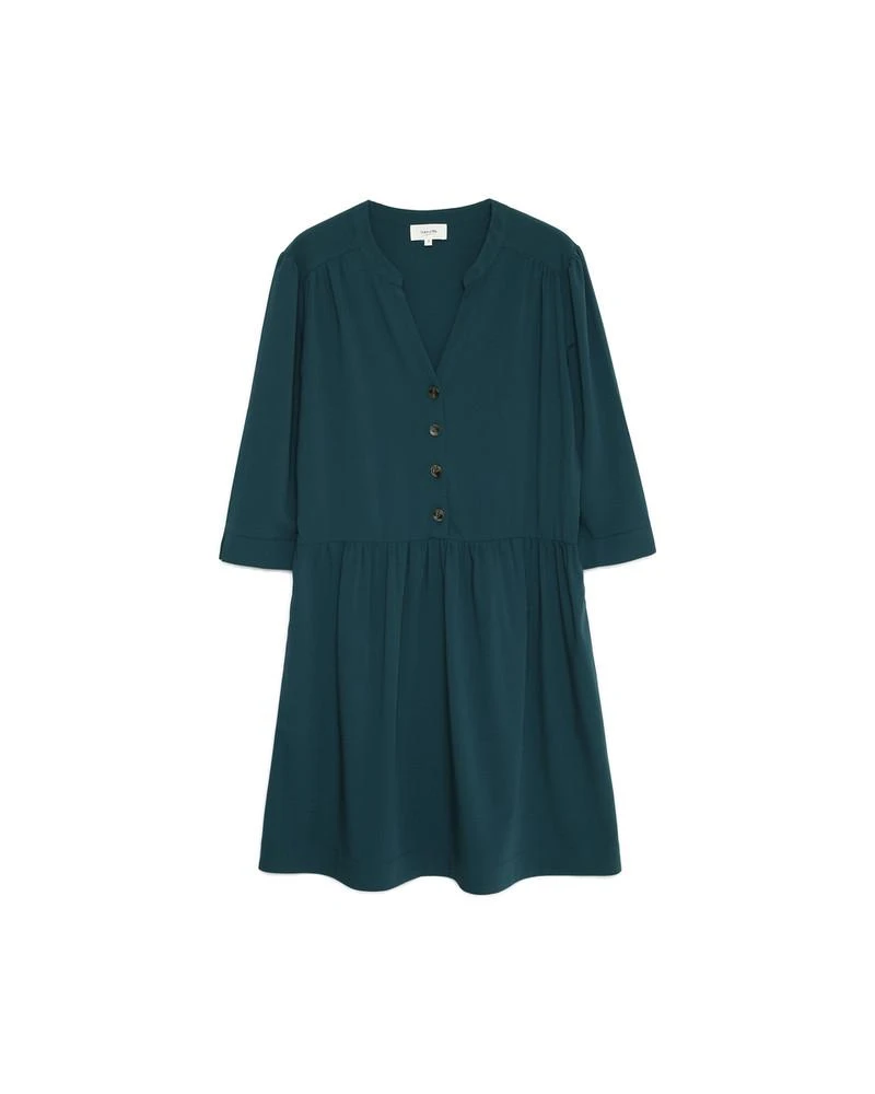 La coupe : DARLENE est une robe courte, à manches 3/4 avec une encolure en V, une patte de boutonnage sur le devant et le long de la taille.