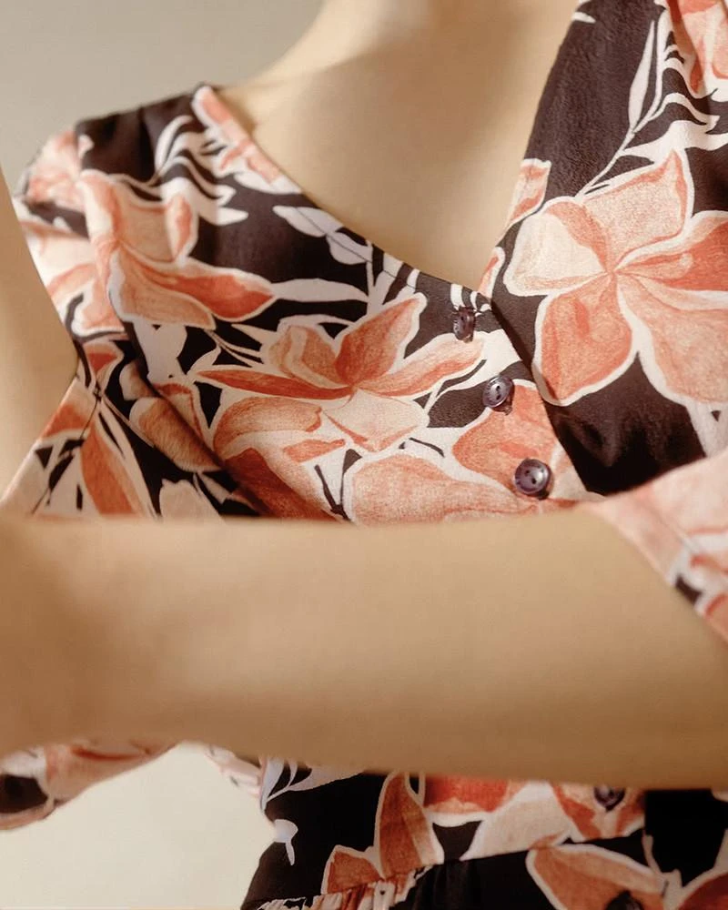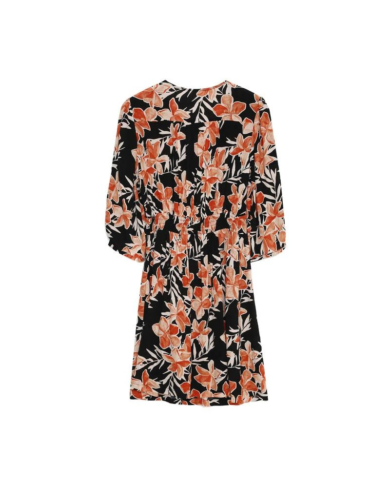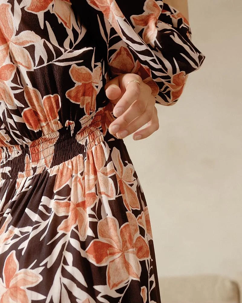 La coupe : DASHA est une robe courte à manches 3/4, avec des fronces sur le corsage au devant, une taille smockée au dos et une patte de boutonnage sur le devant.