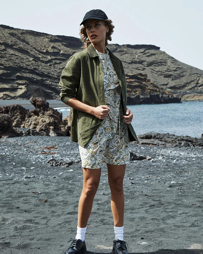 La coupe : DEMAIN est une robe courte imprimée à manches 3/4, en popeline, avec une encolure ras du cou et des détails de plis et de volants sur la poitrine.