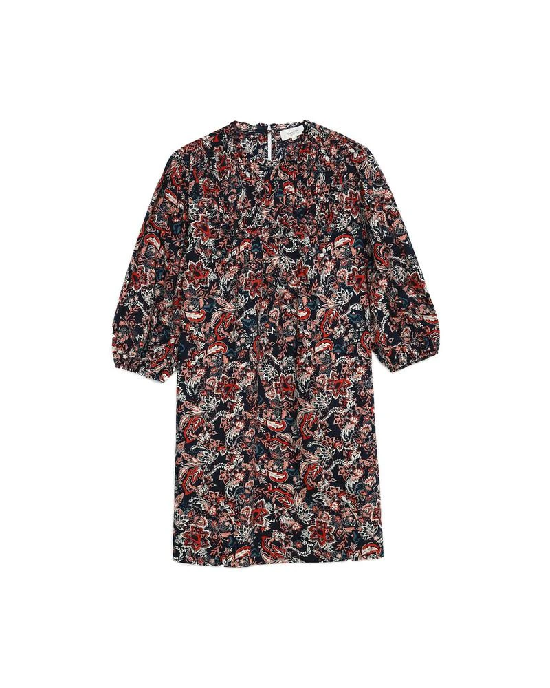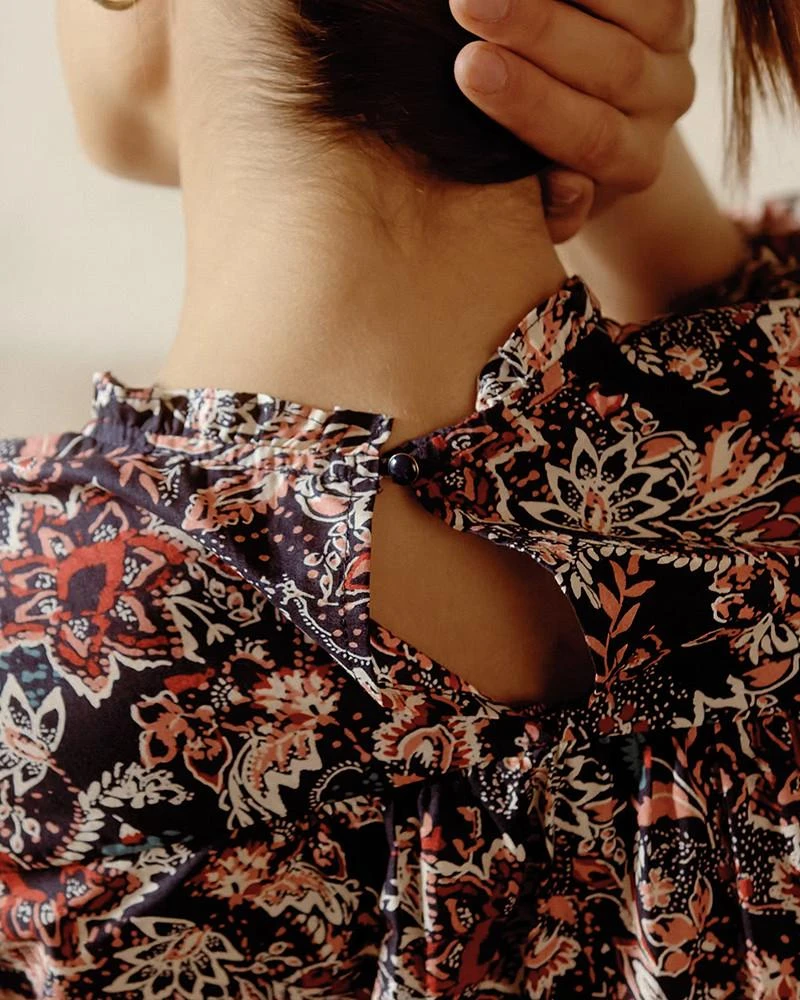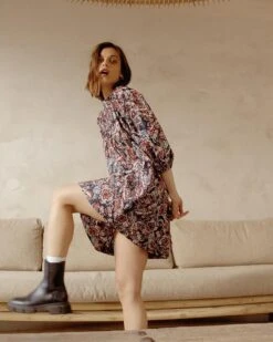La coupe : DEMAIN est une robe courte imprimée à manches 3/4, en popeline, avec une encolure ras du cou et des détails de plis et de volants sur la poitrine.