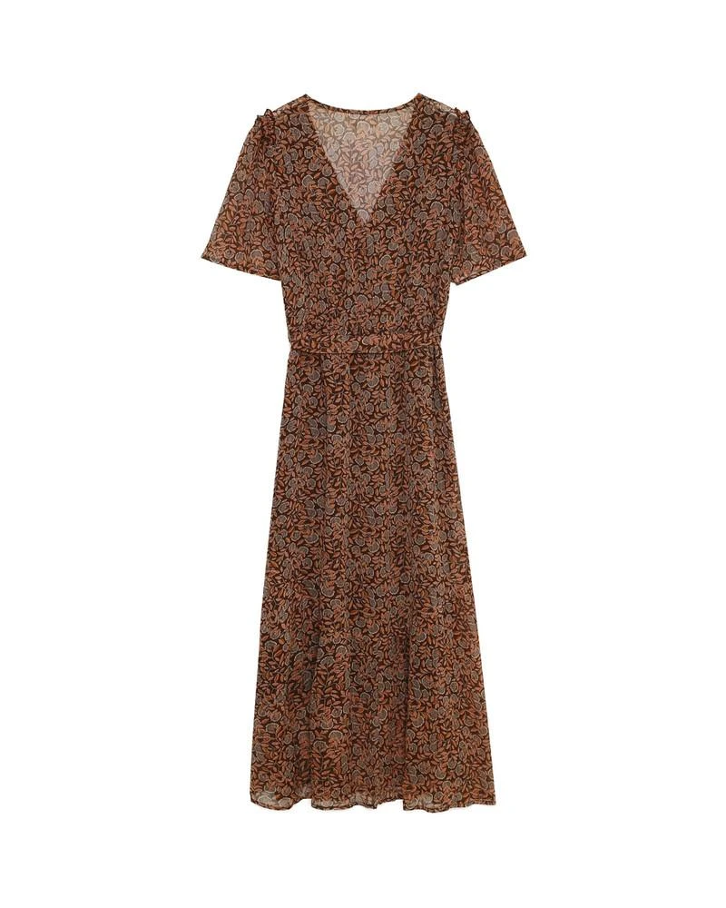 « La coupe : DEMOISELLE est une robe longue imprimée à manches courtes, en mousseline, avec un décolleté en V sur le devant, des petits volants intérieurs sur les épaules et une taille élastiquée avec ceinture à nouer.