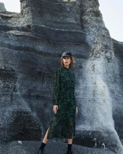 La coupe : DENA est une robe-chemise longueur midi imprimée, à manches longues en mousseline, avec un col classique, une ceinture à nouer à la taille, une patte de boutonnage sur le devant et des fentes latérales à l’ourlet.