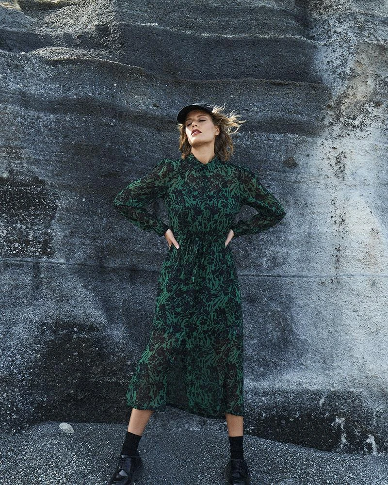 La silhouette : Ravissante robe-chemise doublée, DENA s’impose comme une des robes iconiques de cette collection. On se laisse séduire par son imprimé all over, inspiration rétro et son joli tissu voilé, qui dévoile subtilement les jambes. L’allure est chic et affirmée.