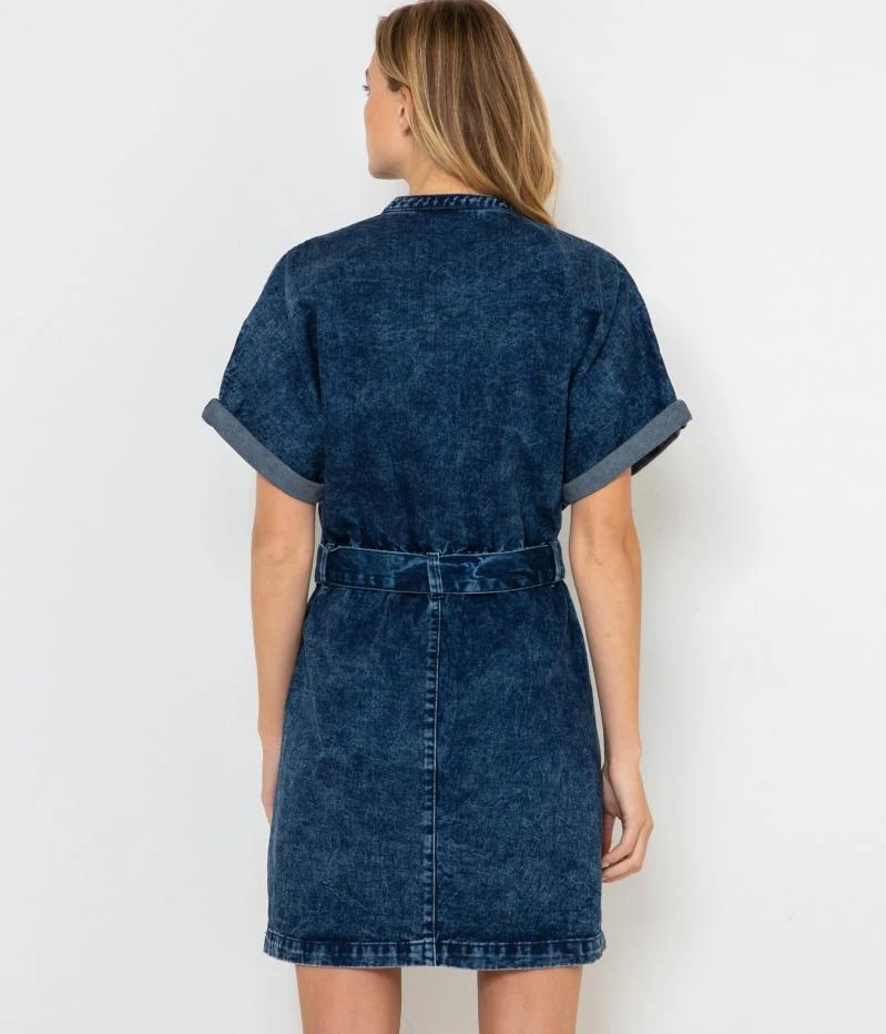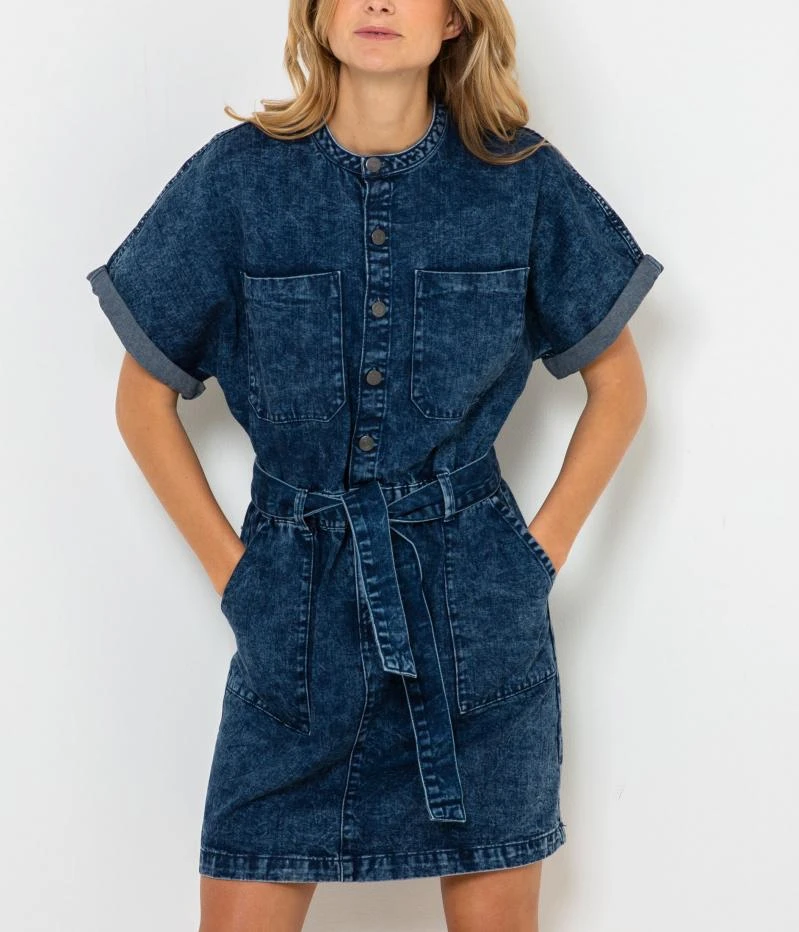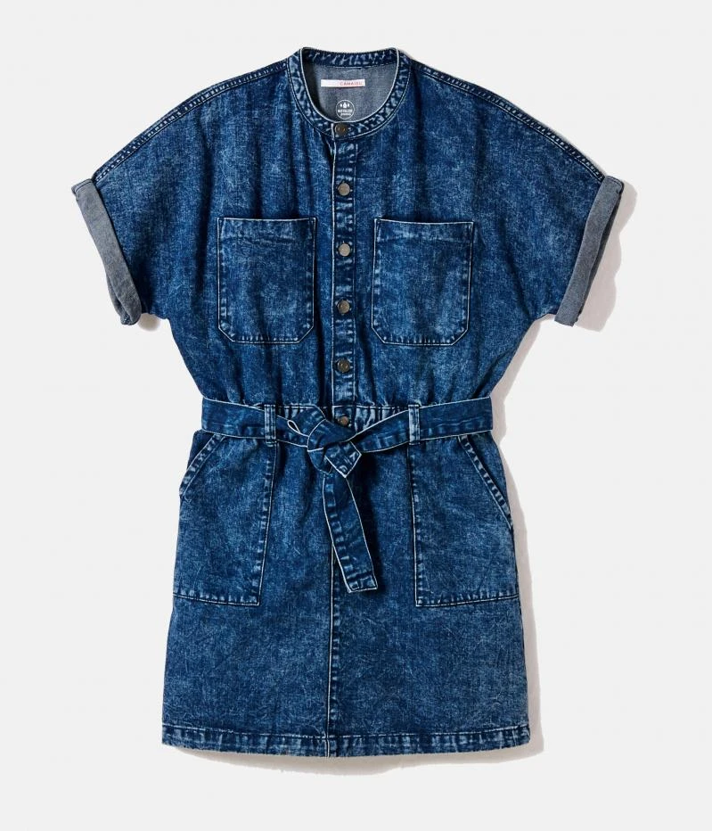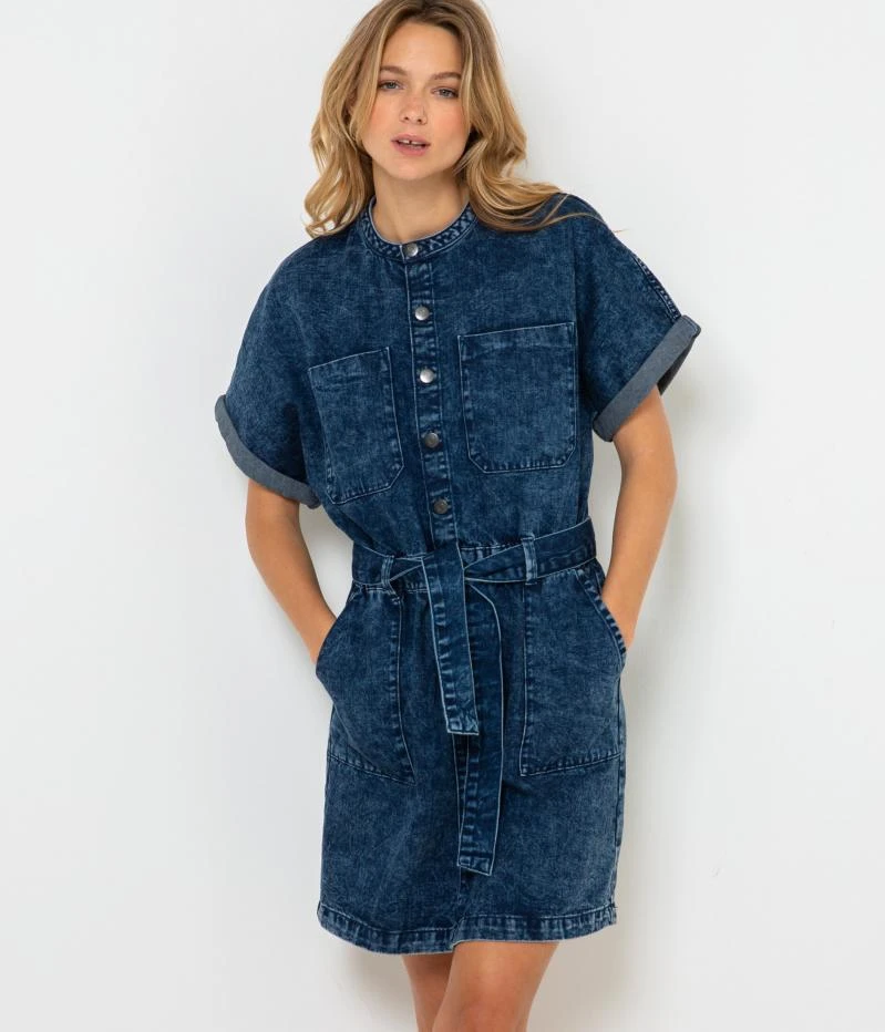 Vente Robe denim waterless process Camaieu – Une robe femme confectionnée en denim de coton. Coupe droite finement ajustée par un lien à nouer à la taille, encolure ronde, fermeture patte boutonnée, revers au bas des manches courtes, poches poitrine, poches plaquées latérales. Le mannequin mesure 1.75M et porte une taille M. Ce produit a été fabriqué à partir d’un procédé de délavage réduisant la consommation d’eau.
