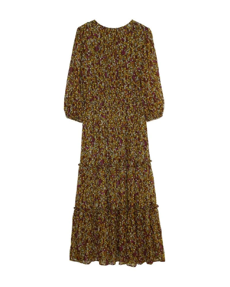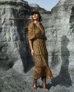 La coupe : DENISE est une robe longue en mousseline imprimée, avec une encolure ronde, des manches courtes avec poignets élastiqués, une taille élastiquée avec une ceinture à nouer et une patte de boutonnage sur le devant.