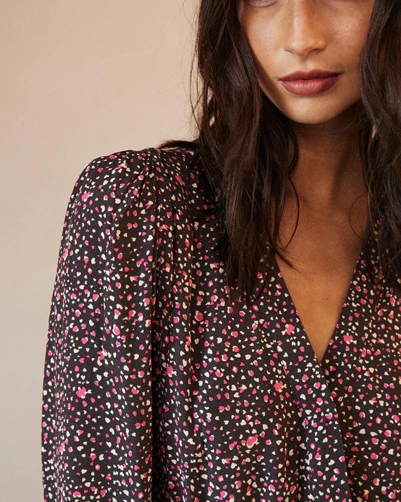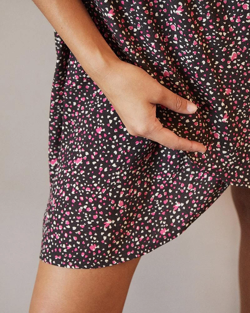 La coupe : DILEMME est une robe courte à manches ballons avec des fronces aux épaules, une taille élastiquée et une jupe asymétrique.