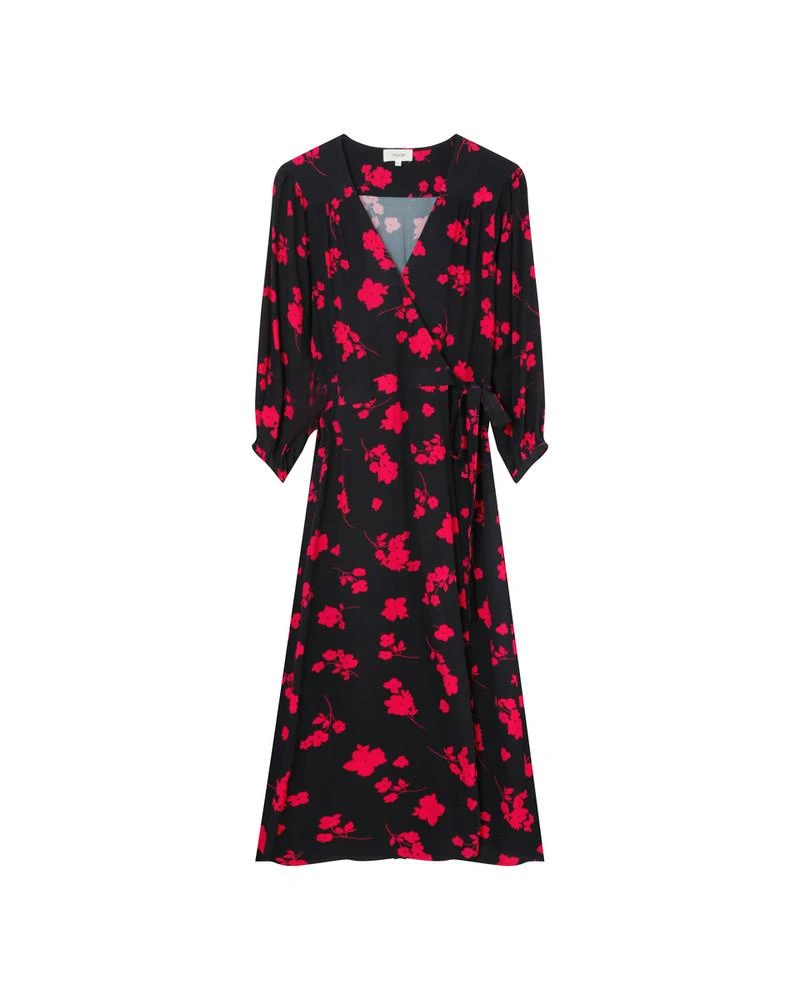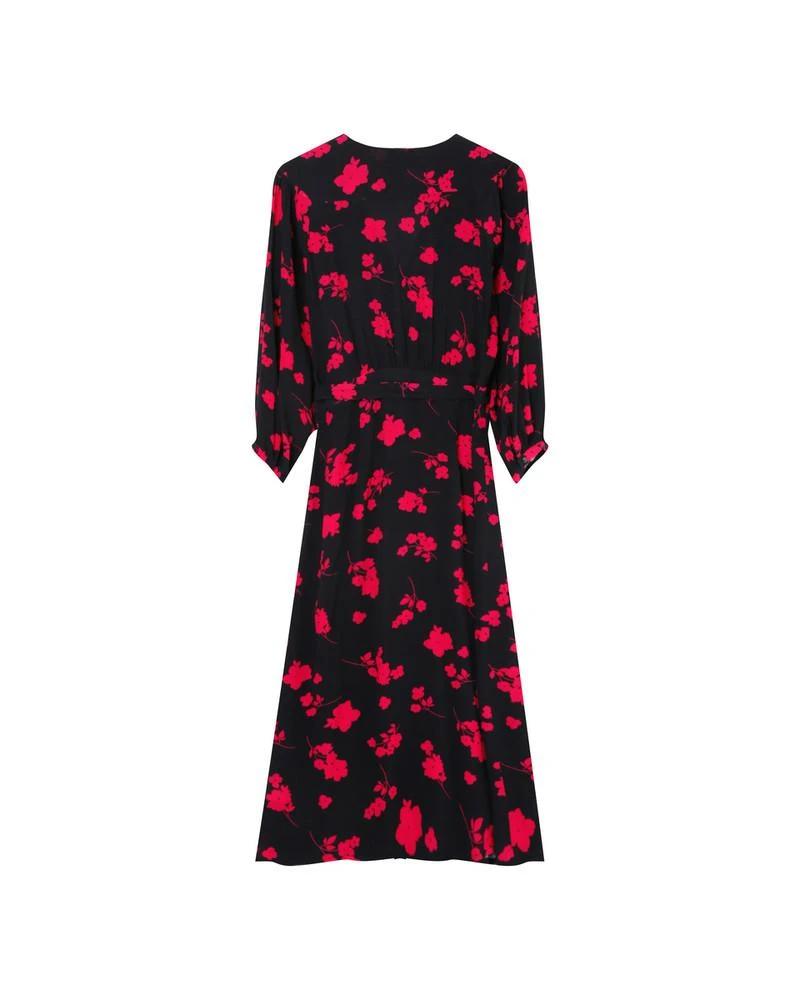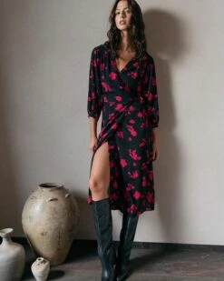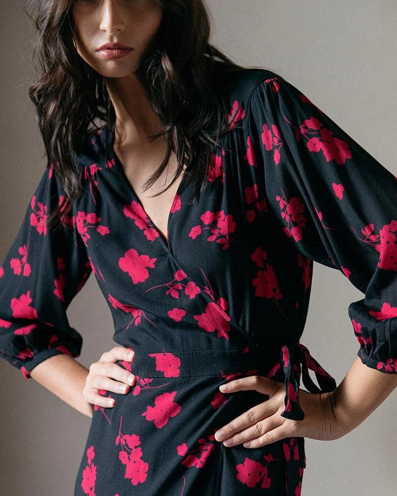 La coupe : DINA est une robe cache-cœur midi doublée en imprimé exclusif G&M. Son encolure dissimule un petit bouton-pression caché sur le devant. Ses manches sont 3/4 avec des boutons aux poignets.