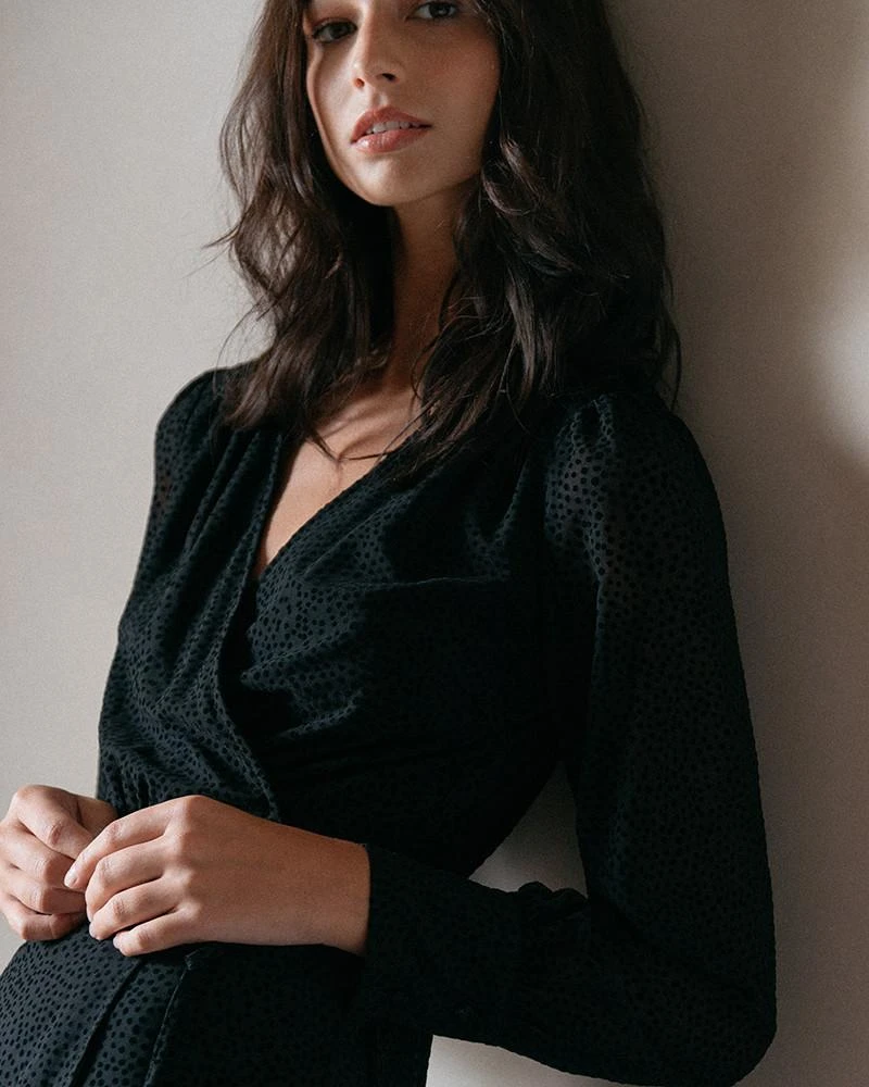 La coupe : DOLORES est une robe courte cache-cœur imprimée de pois en velours. Pièce mode du nouveau vestiaire Grace & Mila, on craque pour la coupe parfaite de cette robe avec sa partie jupe en forme de pétales et ses manches larges et fluides.
