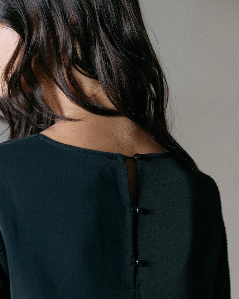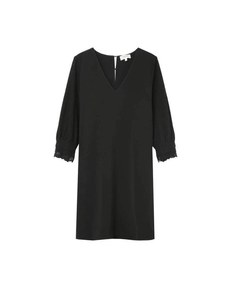 La coupe : DORIANNE est une robe babydoll col en V. Ses manches 3/4 en dentelle avec détails plissés aux poignets révèlent tout le soin délicat apporté à cette pièce de caractère.