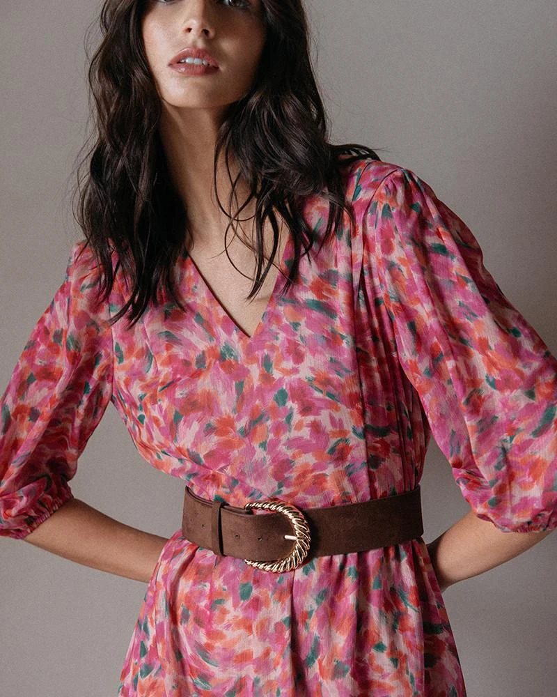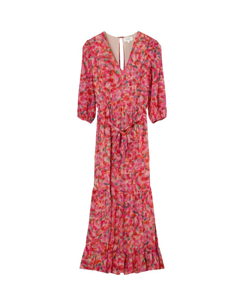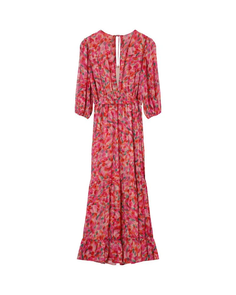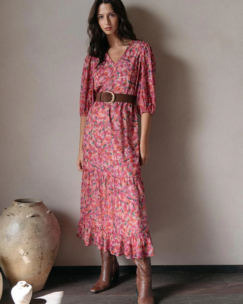 « La coupe : DORIS est une robe longue imprimée à col en V , des manches 3/4 élastiquées et une ceinture de tissu à nouer à la taille.