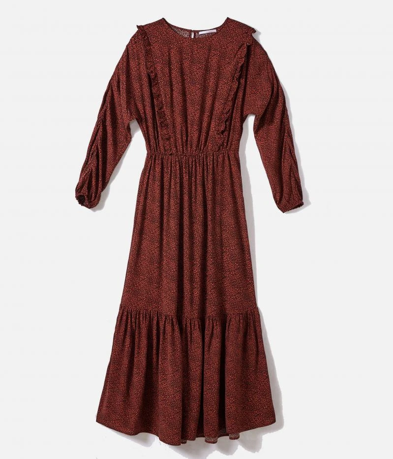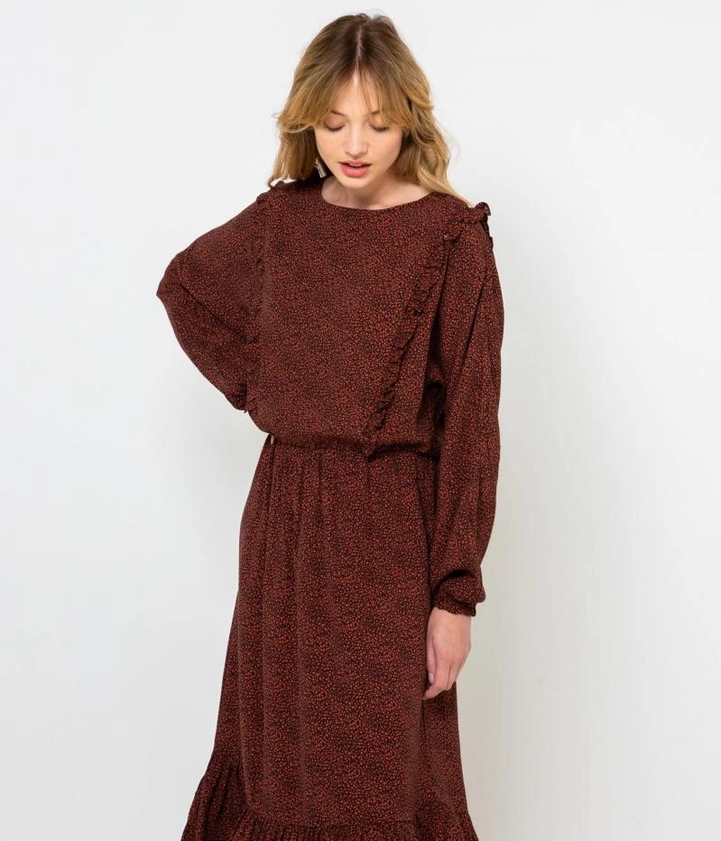 Vente Robe longue imprimée Camaieu – Une robe femme confectionnée en viscose fluide. Coupe longue qui s’évase délicatement au bas par une découpe, volants placés devant, taille marquée, encolure ronde fermée au dos par un bouton, manches longues resserrées, imprimé en all over. Le mannequin mesure 1.75M et porte une taille M.