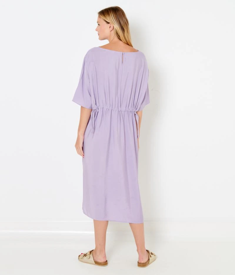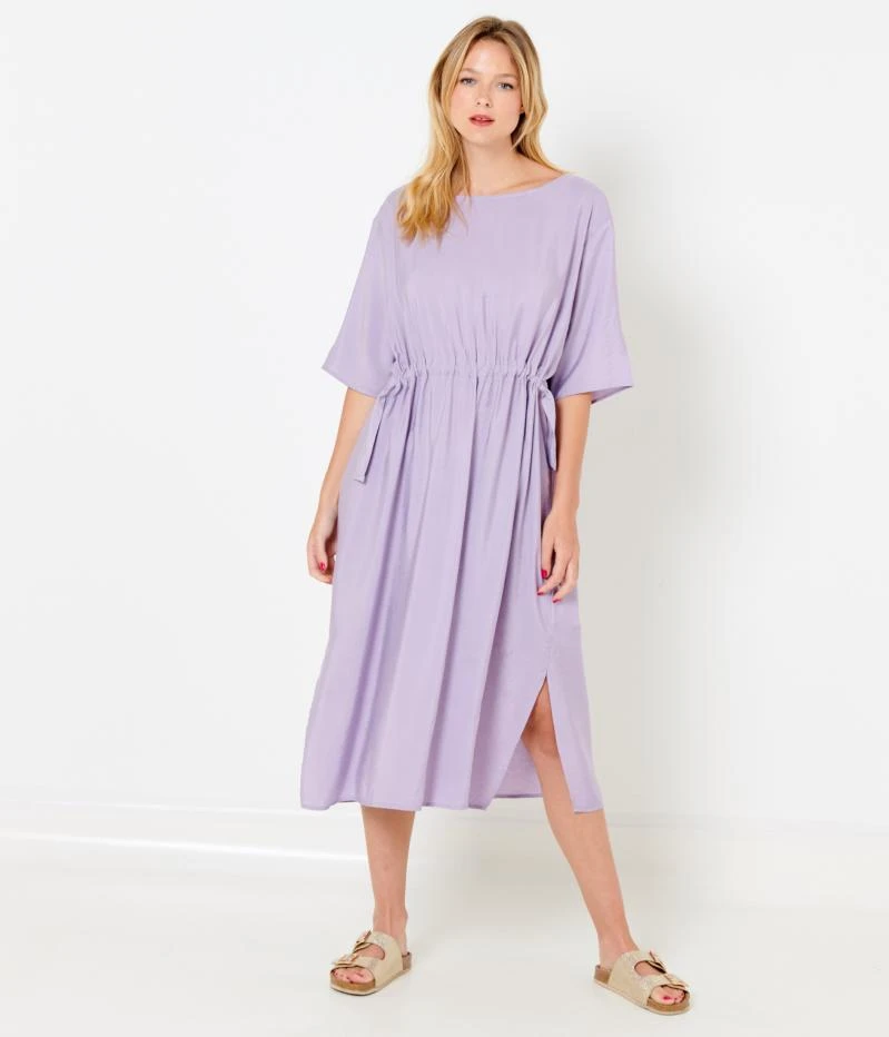 Vente Robe midi lilas large Camaieu – Une robe femme confectionnée en viscose et polyamide. Coupe élargie, encolure dégagée laissant apparaitre une découpe au dos fermée par un petit bouton, emmanchures tombantes pour un porté loose, élastique à la taille, porté fluide, fentes d’aisances à la base. Le mannequin mesure 1.75M et porte une taille 38.