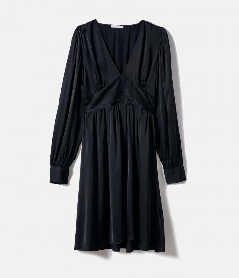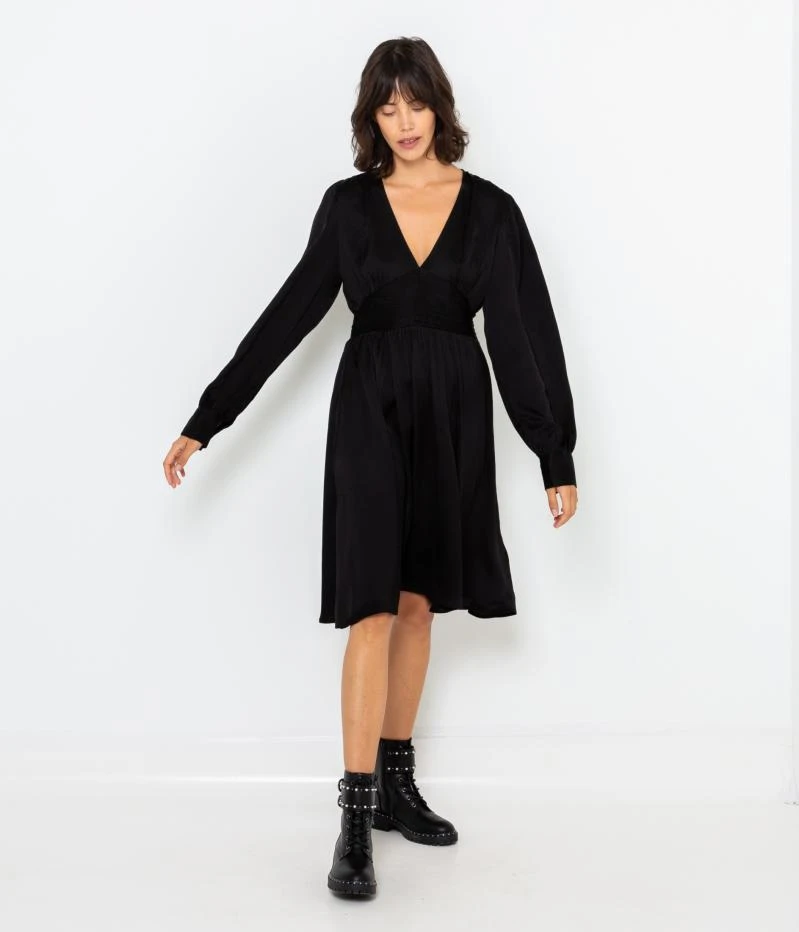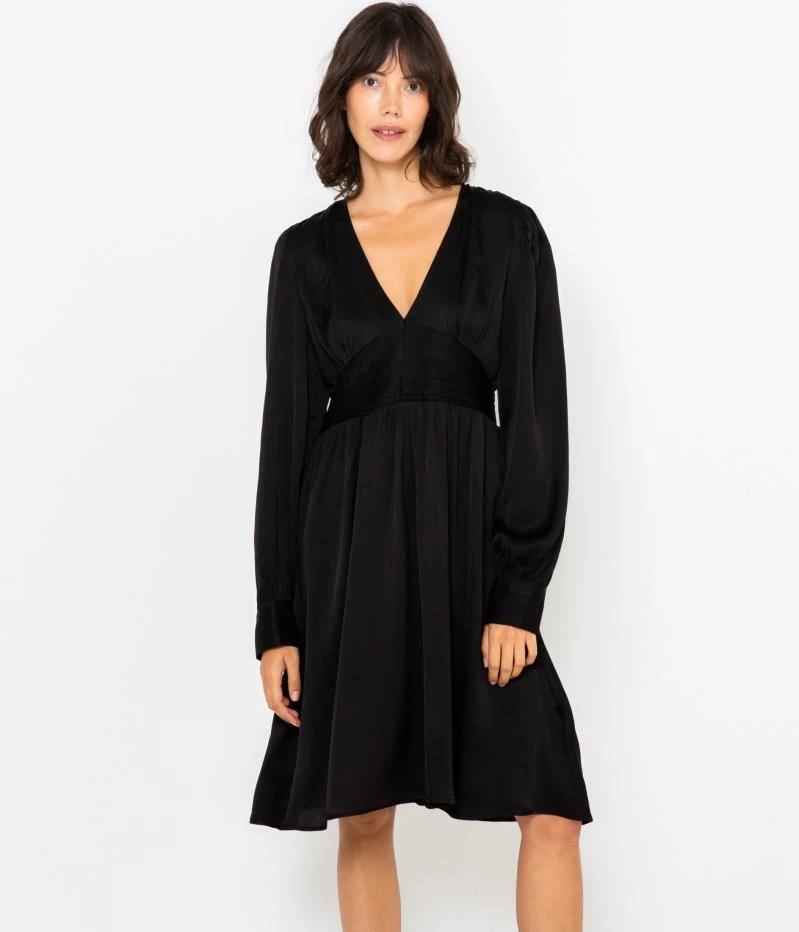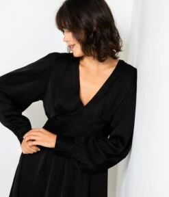 Vente Robe satinée Camaieu – Une robe femme confectionnée en viscose satinée. Coupe ajustée qui s’évase délicatement au bas, grande encolure V, découpe plissée qui marque la taille, fronces épaules et emmanchures, manches longues resserrées, fermeture zip invisible. Pour le coloris deep claret, le mannequin mesure 1.68M et porte une taille 38.