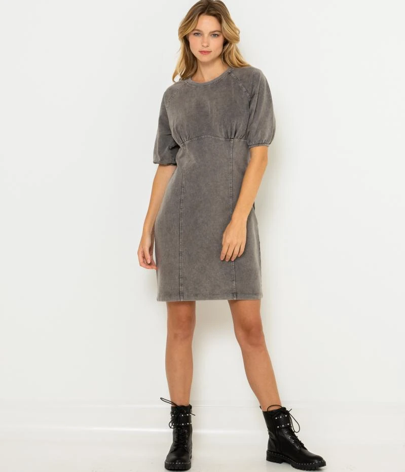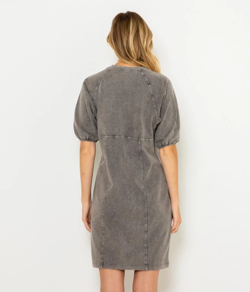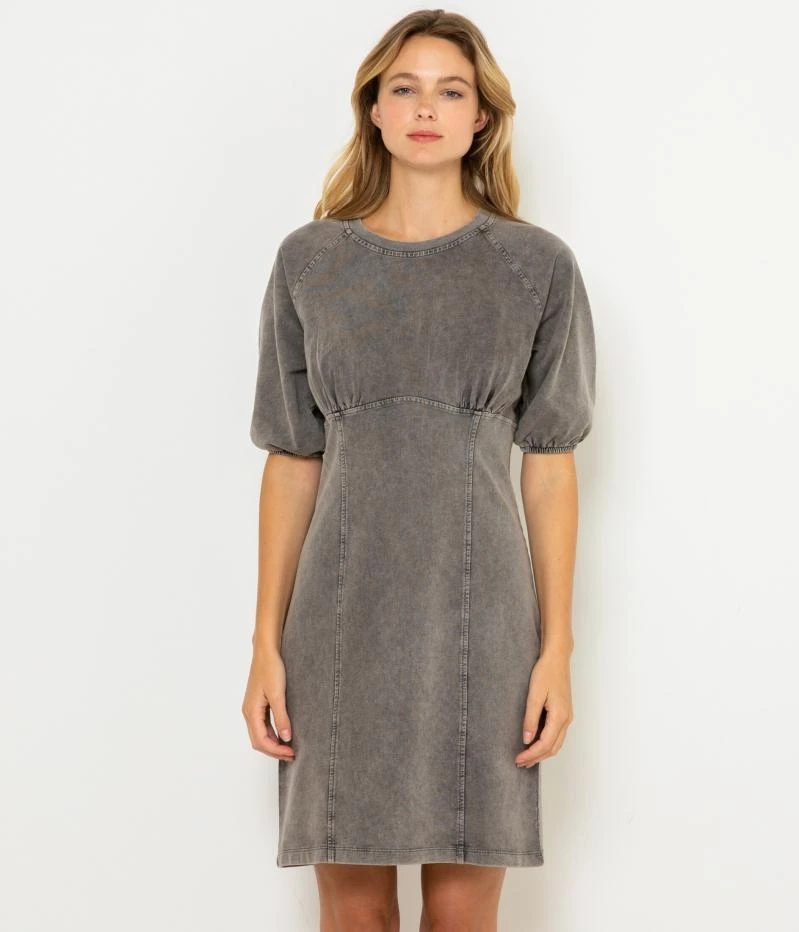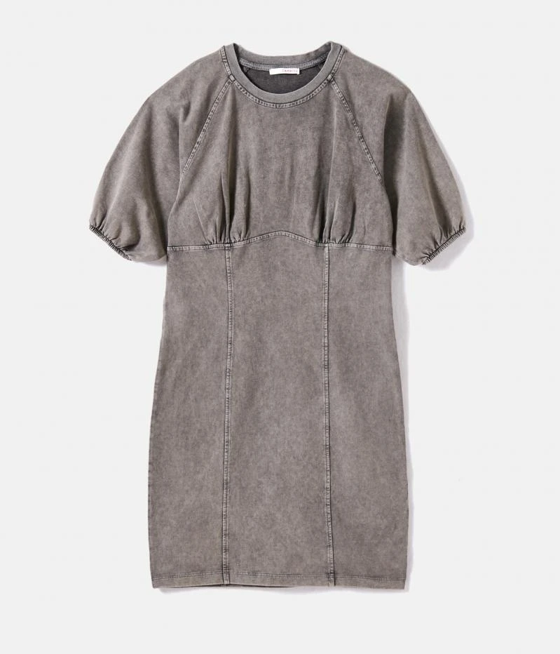 Vente Robe t-shirt gris délavé Camaieu – Une robe femme confectionnée en coton délavé. Coupe droite, texture douce, manches courtes resserrées, col rond avec bord-côte, jeu de découpes, fronces poitrine. Le mannequin mesure 1M75 et porte une taille M.