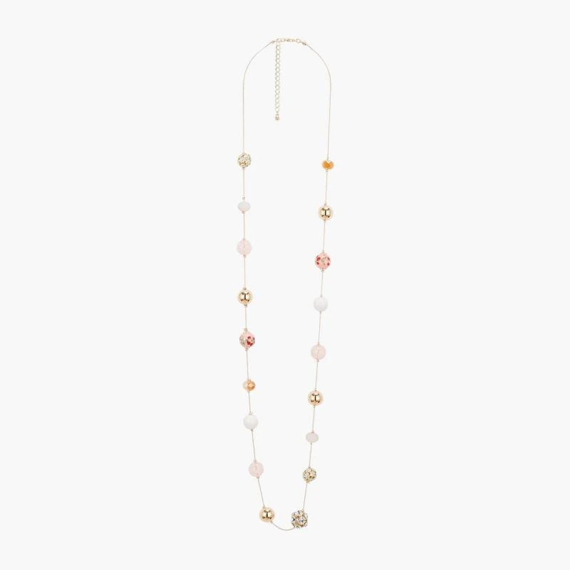 Sautoir en acier inoxydable composé de perles colorées et émail fleuri.