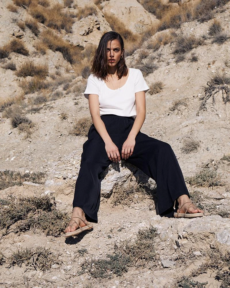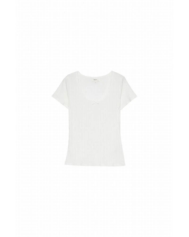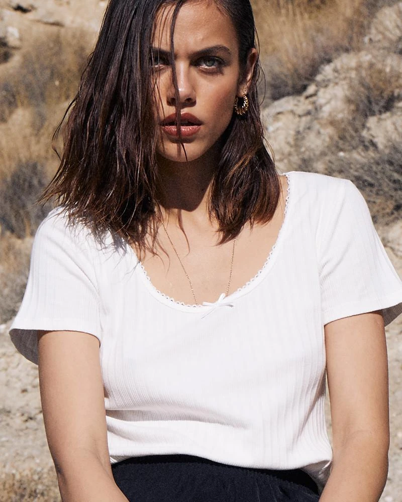 La coupe : CANET est un tee-shirt côtelé avec une large encolure arrondie de danseuse. Ses manches sont courtes, et on remarque une jolie ligne de broderies le long du décolleté avec un petit détail de nœud sur le devant.