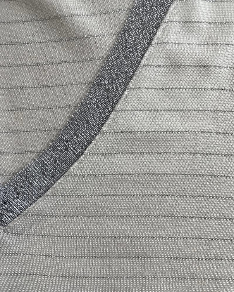 La coupe : CORSE est un tee-shirt à manches courtes col en V avec une bande de lurex côtelé le long de l’encolure.