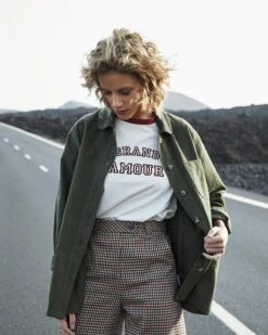 « La coupe : DARCY est un tee-shirt à manches courtes avec une encolure ronde et un message imprimé en velours : « »Grand Amour » ».