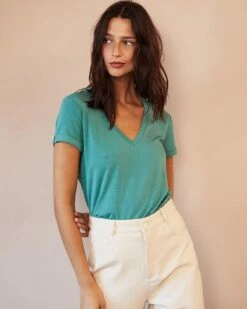 La silhouette : Cet essentiel près du corps est bon basique pour des looks de tous les jours. Son col en V met en valeur le haut de la silhouette. Avec un tissu à 93% en viscose, il rejoint notre gamme en fibres naturelles Un brin de vert. À porter sans modération !