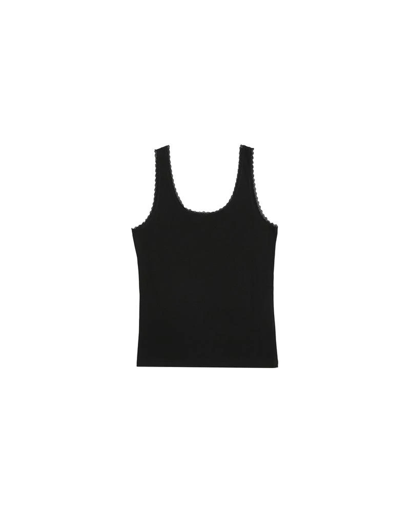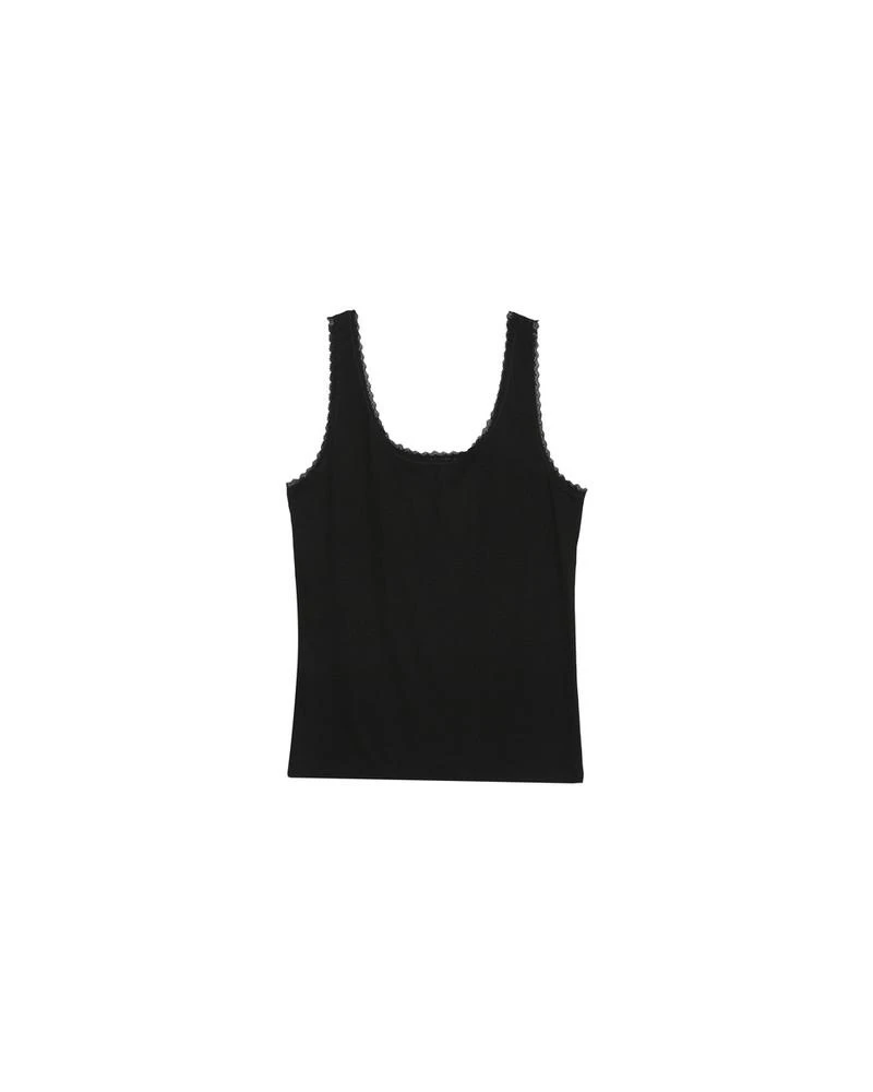 La coupe : DAWN est un débardeur côtelé sans manches, avec une encolure dégagée et de la dentelle ton sur ton à l’encolure et aux emmanchures.