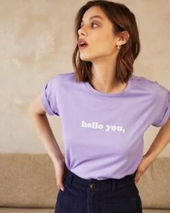 « La coupe : DAWSON est un tee-shirt à manches courtes à revers avec une encolure ronde et message imprimé en velours : « »Hello you » ».