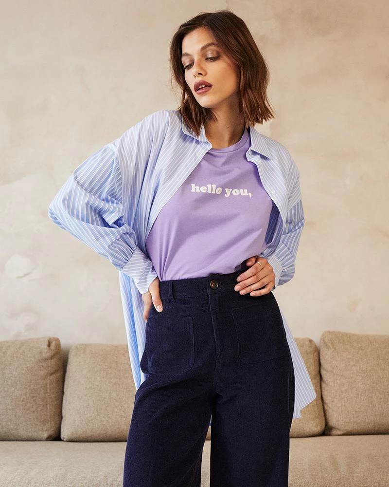 La silhouette : DAWSON est le tee-shirt à message de la saison ! Un basique 100% coton qui rejoint notre gamme en fibres naturelles Un brin de vert. Ce petit message imprimé en velours « »Hello you » » est un petit clin d’oeil à nos équipes en interne qui utilisent très souvent cette expression pour se saluer. Un détail qui a du peps et qui donnera le sourire à tous ceux que vous croiserez. L’allure est cool et décontractée.